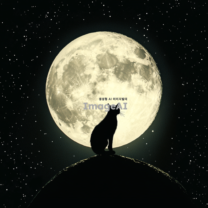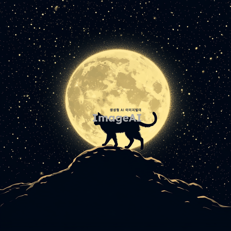 밤하늘에 밝은 보름달이 떠 있는 풍경 속에서, 고양이가 달 위를 우아하게 걷고 있는 모습. 고양이는 검은 실루엣만 보이는 모습, 달빛에 반사되어 신비로운 분위기를 자아내고 있다. 배경은 별이 가득한 어두운 하늘로, 고양이의 실루엣이 보름달의 빛에 살짝 드러나고 있다.