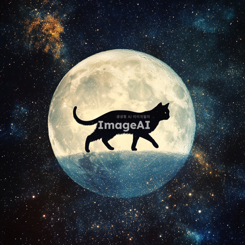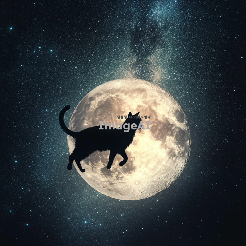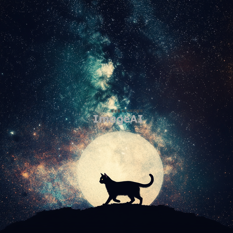 은하수를 배경으로, 밝은 보름달의 표면 바로 위를 걷고 있는 검은고양이. 은하수는 다양한 색상의 별들로 가득 차 있고, 전체적인 분위기는 몽환적이고 신비로운 느낌.