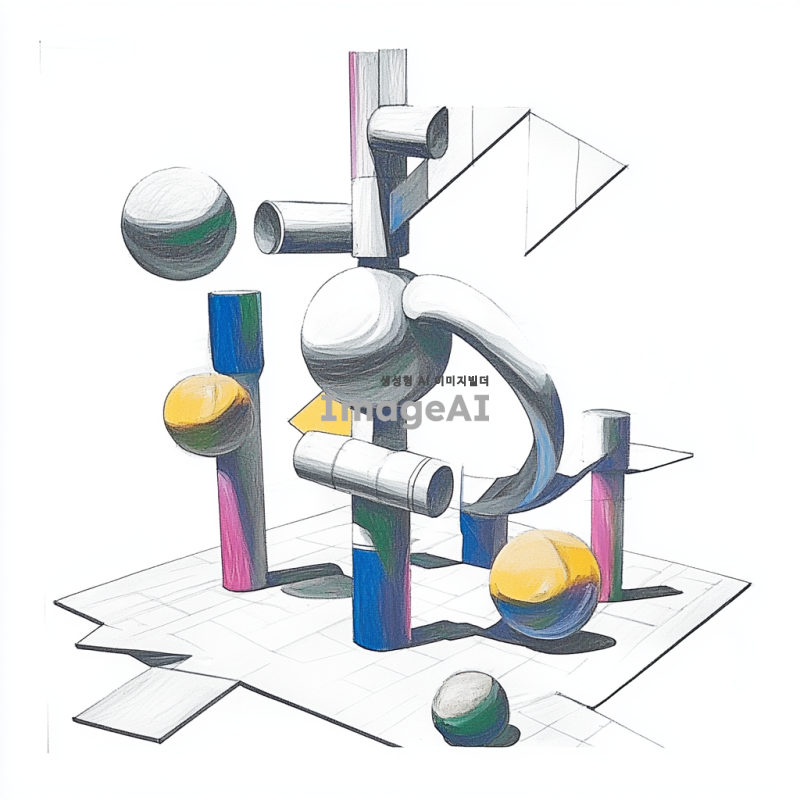 기하학적인 조각품을 주제로 한 스케치, 원기둥, 원뿔, 삼각뿔, 정육면체, 구, 반구 등의 기하학적 형태가 조화롭게 배열된 모습, 현대적인 디자인 요소와 함께 독창적인 형태를 강조, 부드러운 선과 대칭적인 구성, 배경은 단순하고 깔끔하게 처리된 느낌의 아트워크.