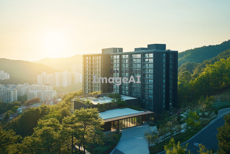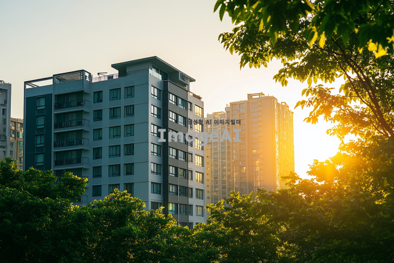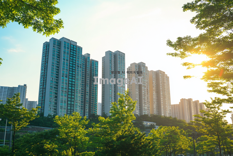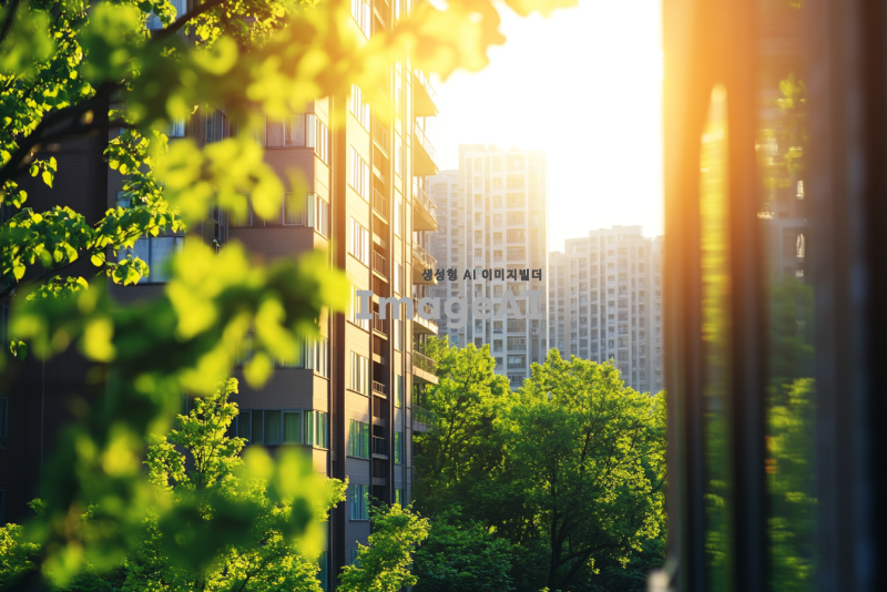 한국 아파트의 근처에서 촬영한 듯한 이미지, 햇빛에 반사되어 빛나는 유리창, 현대적인 건축 스타일, 주변의 푸른 나무와 맑은 하늘, 따뜻한 분위기, 일상적인 도시 풍경, 세련된 느낌을 주는 아파트 단지, 자연과 조화로운 모습