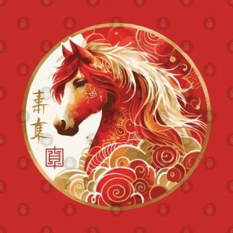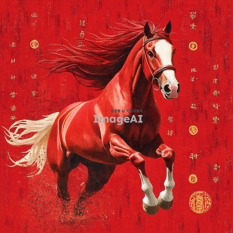 붉은 배경에서 힘차게 달리는 붉은 말, 생동감 넘치는 표정과 우아한 자세, 빛나는 갈기와 꼬리, 강렬한 색감이 강조된 장면, 한국의 전통적인 요소가 어우러진 분위기.