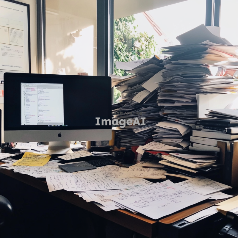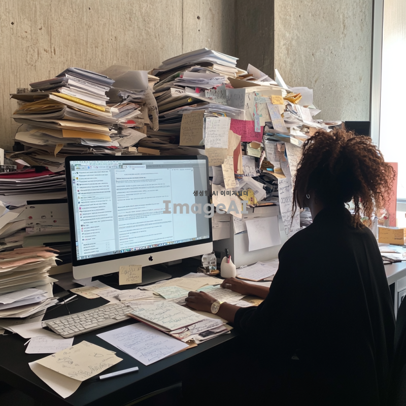 인스타그램 스토리 화면인데 스토리 사진은 컴퓨터 주위에 서류가 가득 쌓인 자리에 앉아서 1인칭으로 찍은 사진이면 좋겠어. 계정 이름은 마음대로 해도 돼.