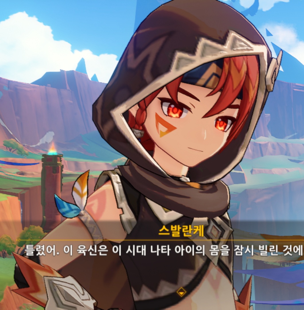 원신의 스발란케 캐릭터를 중심으로 한 일러스트, 배경은 아무것도 없이 하얗게, 유쾌하고 털털한 성격이라 웃으면서 브이를 하고 있는 포즈.