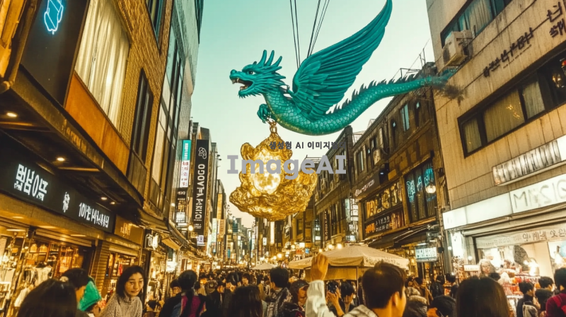 명동거리의 화려한 야경을 배경으로 하늘에 청룡이 여의주를 물고 있는 장면, 청룡의 비늘은 빛나는 푸른색으로 표현되며, 여의주는 황금빛으로 빛나고 있다. 주변에는 사람들과 상점들이 가득하고, 하늘은 저녁 노을로 물들어 있다. 청룡의 위엄 있는 모습과 함께 명동의 활기찬 분위기가 잘 어우러져 있다.