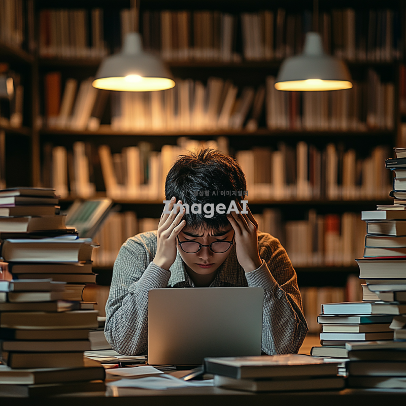 대학 도서관에서 책과 노트북에 둘러싸인 한국인 대학생, 스트레스를 받으며 머리를 감싸고 있는 모습, 눈에 피로가 가득하고 주변은 어지럽혀진 자료들로 가득, 어두운 조명 아래에서 집중하려고 애쓰는 모습, 긴장감이 흐르는 배경, 현대적인 대학 환경.