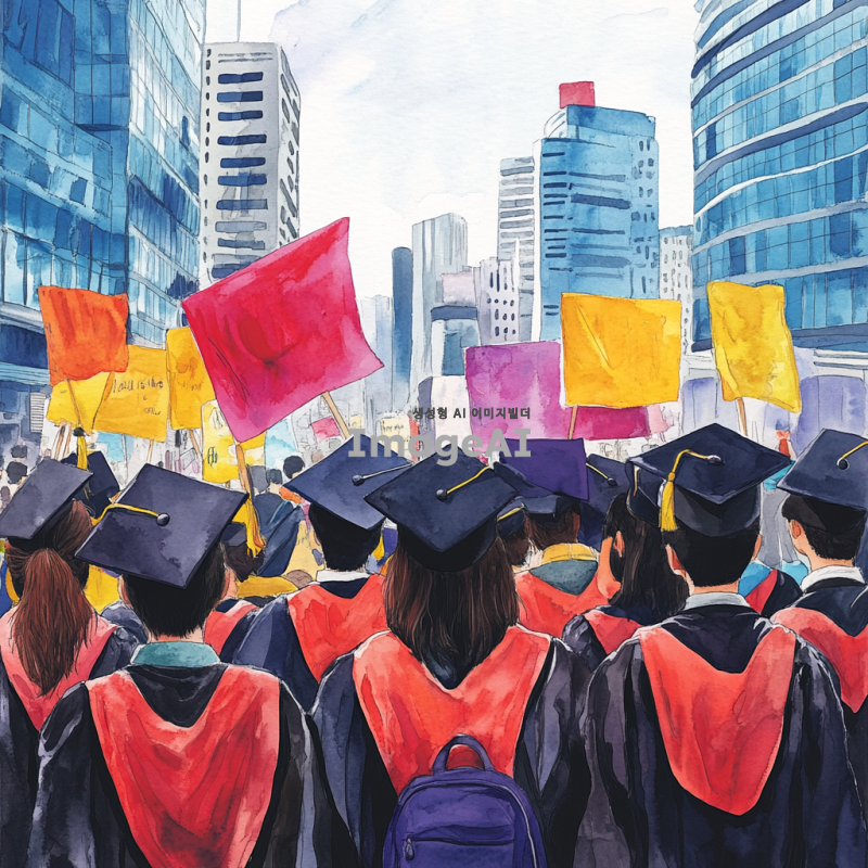 거대한 사회 앞에서 친구들과 함께 맞서 싸우는 대학 졸업 예정자들, 다양한 감정이 담긴 표정, 단체로 모여 결의를 다지는 모습, 배경에는 도시의 고층 건물과 시위 배너, 청춘의 열정과 연대감을 강조, 화려한 색감과 역동적인 구도