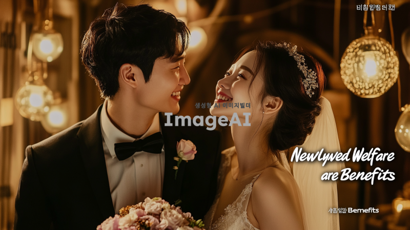 신혼부부 복지혜택 안내글의 타이틀 이미지, 부드러운 조명 아래 사랑스러운 한국인 신혼부부가 웃으며 서로를 바라보는 모습, 화사한 꽃다발과 함께 웨딩드레스와 턱시도를 입고 있는 모습, 배경에는 따뜻한 색감의 아늑한 실내 공간, 감성적인 분위기와 함께 "신혼부부 복지혜택"이라는 글씨가 부드럽게 어우러지는 디자인.