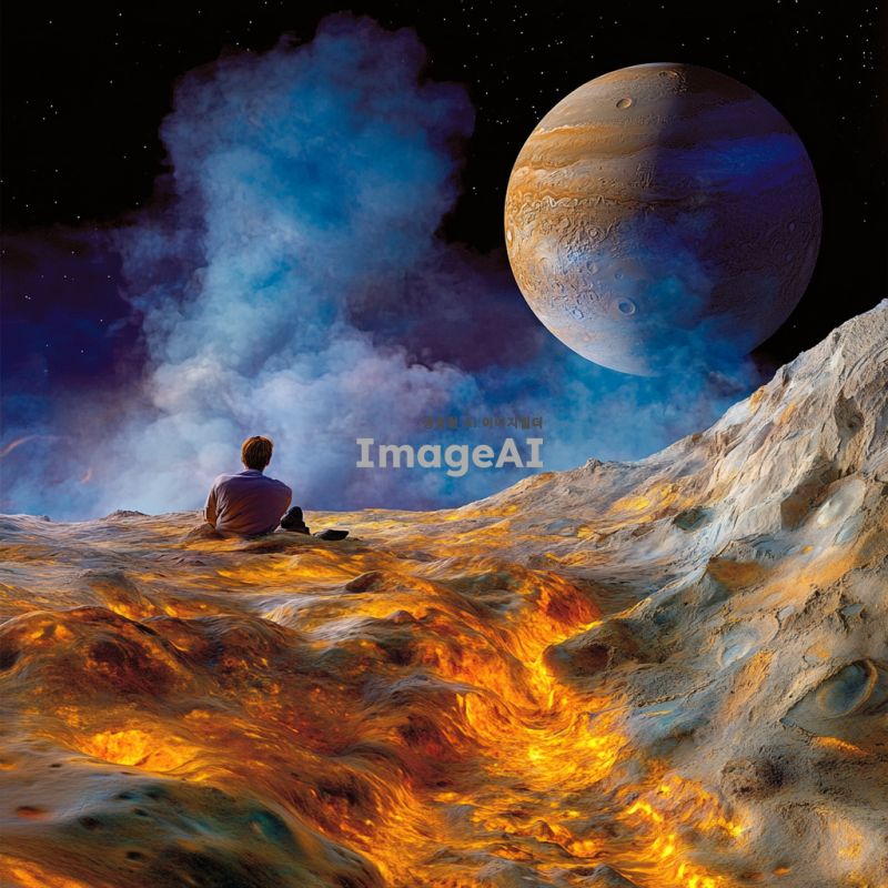 목성이 푸른 빛을 발하며 배경에 자리잡고 있고, 그 옆에는 가니메데의 표면이 보이는 장면. 화산 폭발이 자주 일어나는 이오의 표면에 앉아 있는 한국인 남성의 모습. 화산이 분출하며 연기와 용암이 하늘로 솟구치고, 주변은 황색과 주황색의 화산재로 덮여 있는 풍경. 남성은 편안한 자세로 앉아 있으며, 신비로운 우주를 바라보는 표정을 짓고 있다.
