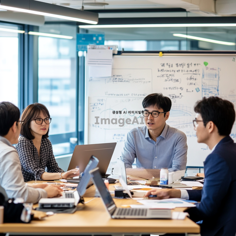 비즈니스 분석을 위한 다양한 관점의 전문가들이 모여 있는 회의실. 밀착 멘토가 한국인 남성으로, 내부 전문가가 한국인 여성으로, 외부 전문가가 한국인 남성으로, 스타트업 대표가 한국인 여성으로 각각 앉아 있다. 각자의 노트북과 자료를 앞에 두고 열띤 토론을 벌이고 있으며, 화이트보드에는 다양한 비즈니스 모델과 전략이 적혀 있다. 회의실은 현대적이고 세련된 디자인으로, 창문을 통해 자연광이 들어오고 있다.