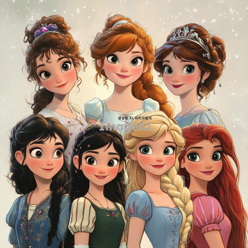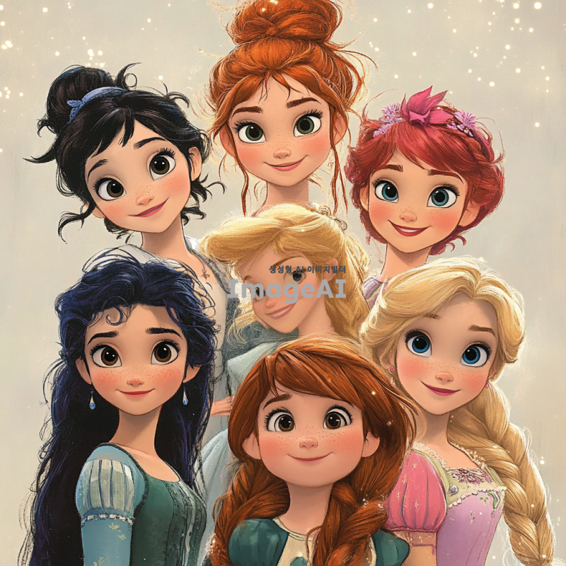 디즈니 캐릭터 바넬로피, 안나, 메리다, 오로라, 에리얼, 신데렐라, 벨, 총 7명이 함께 있는 그림