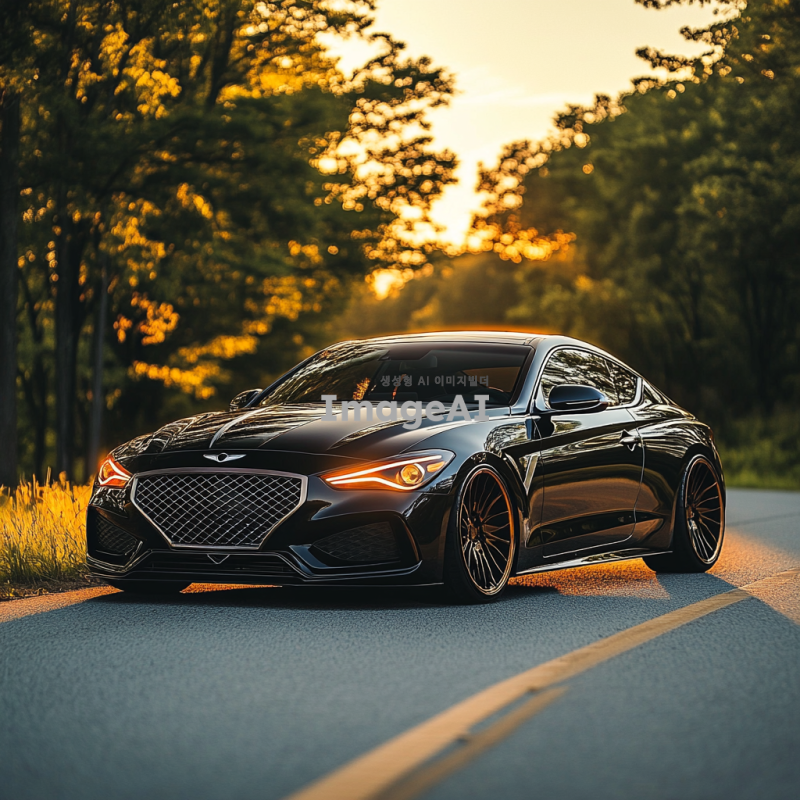 튜닝이 된 제네시스 쿠페, 세련된 외관과 강력한 엔진, 스포티한 디자인, 고급스러운 내부 인테리어, 도로 위에서 역동적으로 주행하는 모습, 현대적인 배경, 저녁 노을 아래에서 빛나는 차체, 세밀한 디테일과 함께 역동적인 감정 표현.