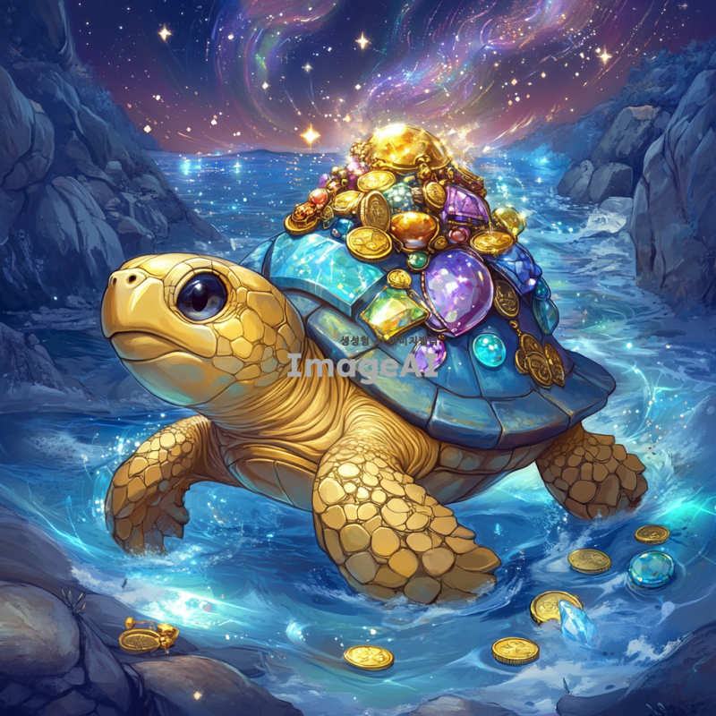 큰 은빛 호숫가에 거대한 귀여운 황금 거북이가 보물들을 등에 업고 있는 모습. 호숫가는 오로라빛으로 가득 빛나며, 신비로운 분위기를 자아내고 있다. 주변에는 별들이 반짝이고, 부드러운 물결이 일고 있다. 거북이는 사랑스러운 표정을 짓고 있으며, 보물들은 다양한 색깔의 보석과 금화로 이루어져 있다.