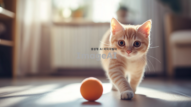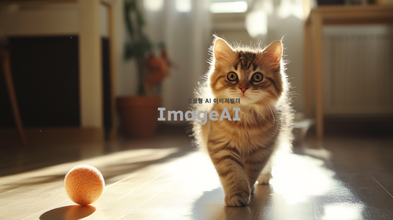 귀여운 고양이가 햇살 가득한 방 안에서 놀고 있는 모습, 부드러운 털과 큰 눈, 장난감 공을 가지고 뛰어다니는 모습, 배경에는 아기자기한 인테리어 소품들이 있는 따뜻한 분위기, 16:9 비율