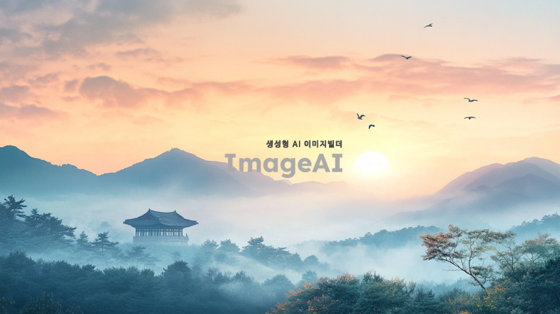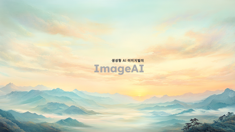 새벽 하늘의 아름다움을 담은 그림, 부드러운 파스텔 색조의 구름이 펼쳐진 하늘, 태양이 수평선에서 떠오르는 장면, 조용한 자연의 분위기, 한국의 전통적인 경치와 어우러진 풍경, 16:9 비율