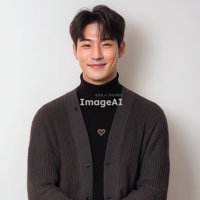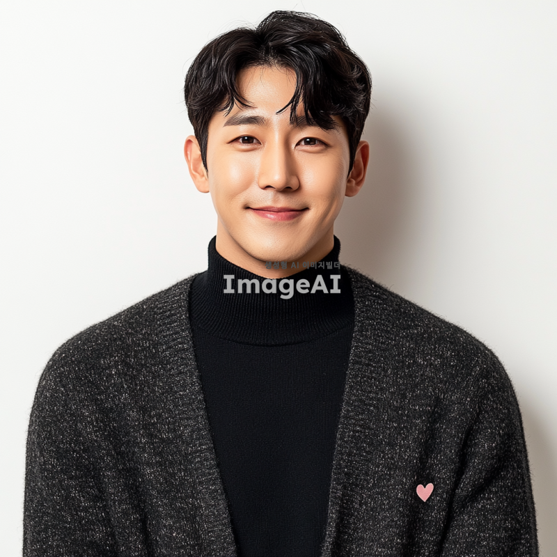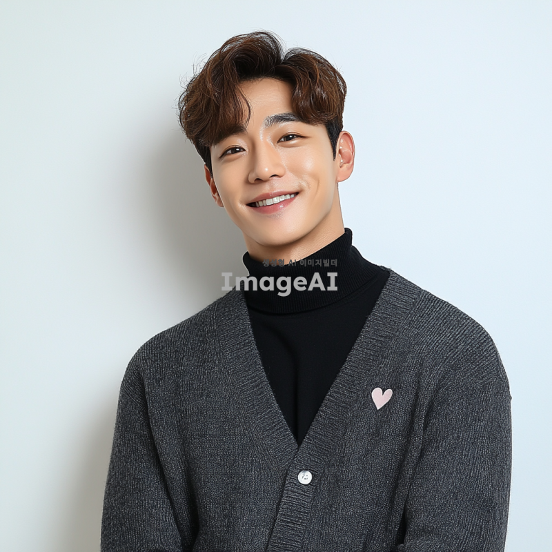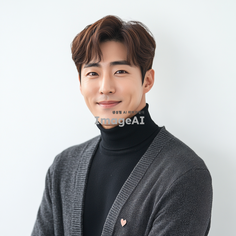 매력적인 한국 남성의 전신 사진으로, 30대 후반에 검은색 터틀넥과 작은 하트 로고가 있는 회색 카디건을 입고 부드럽게 미소 지으며 흰색 배경에 서 있습니다. 짧은 머리를 옆으로 넘기고 있으며, 카메라를 향해 부드럽게 미소 지을 때 눈이 약간 반짝입니다. 조명이 부드럽고 따뜻하여 그의 특징을 강조하고 아늑한 분위기를 만들어 전체적인 구성에 깊이와 개성을 더합니다.