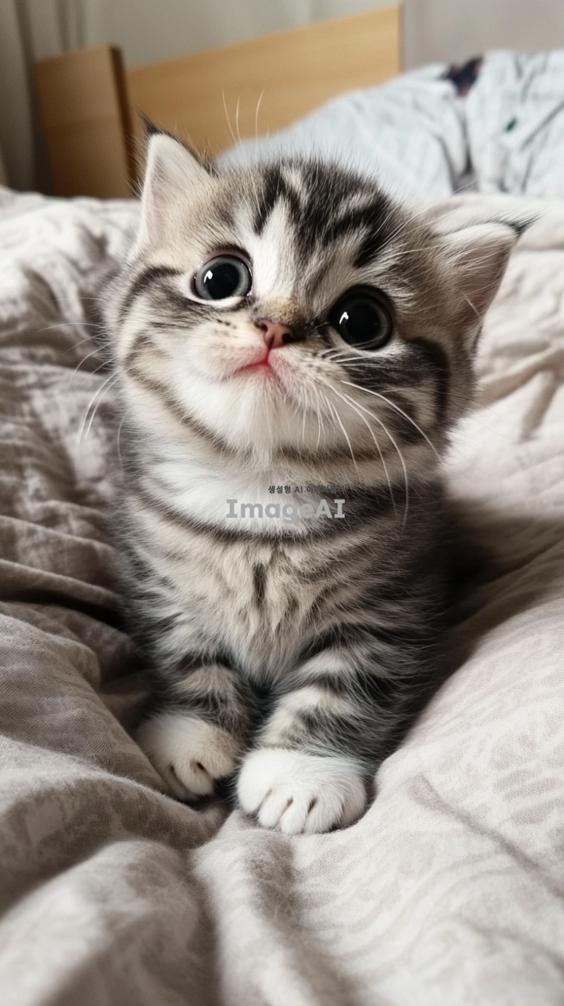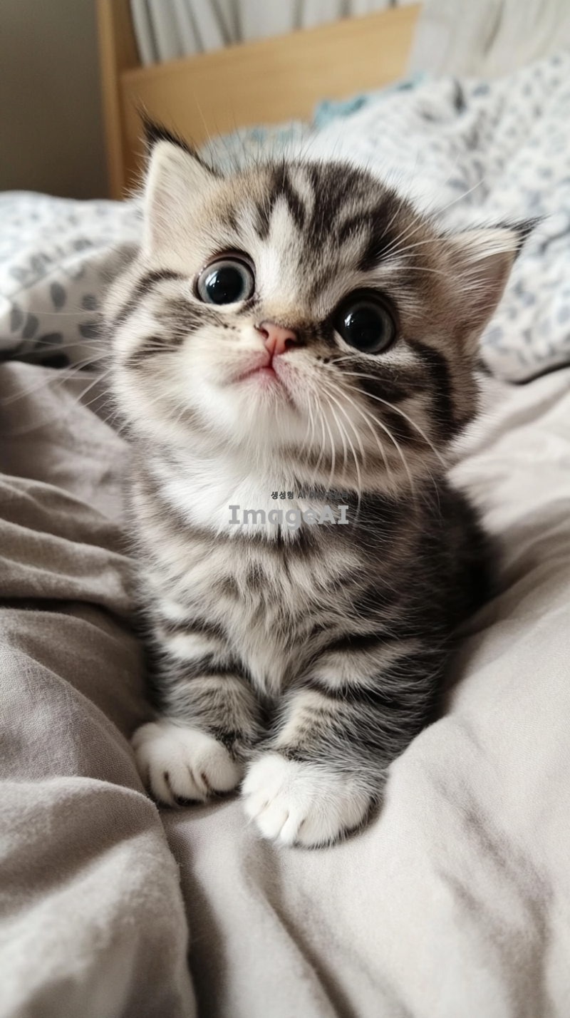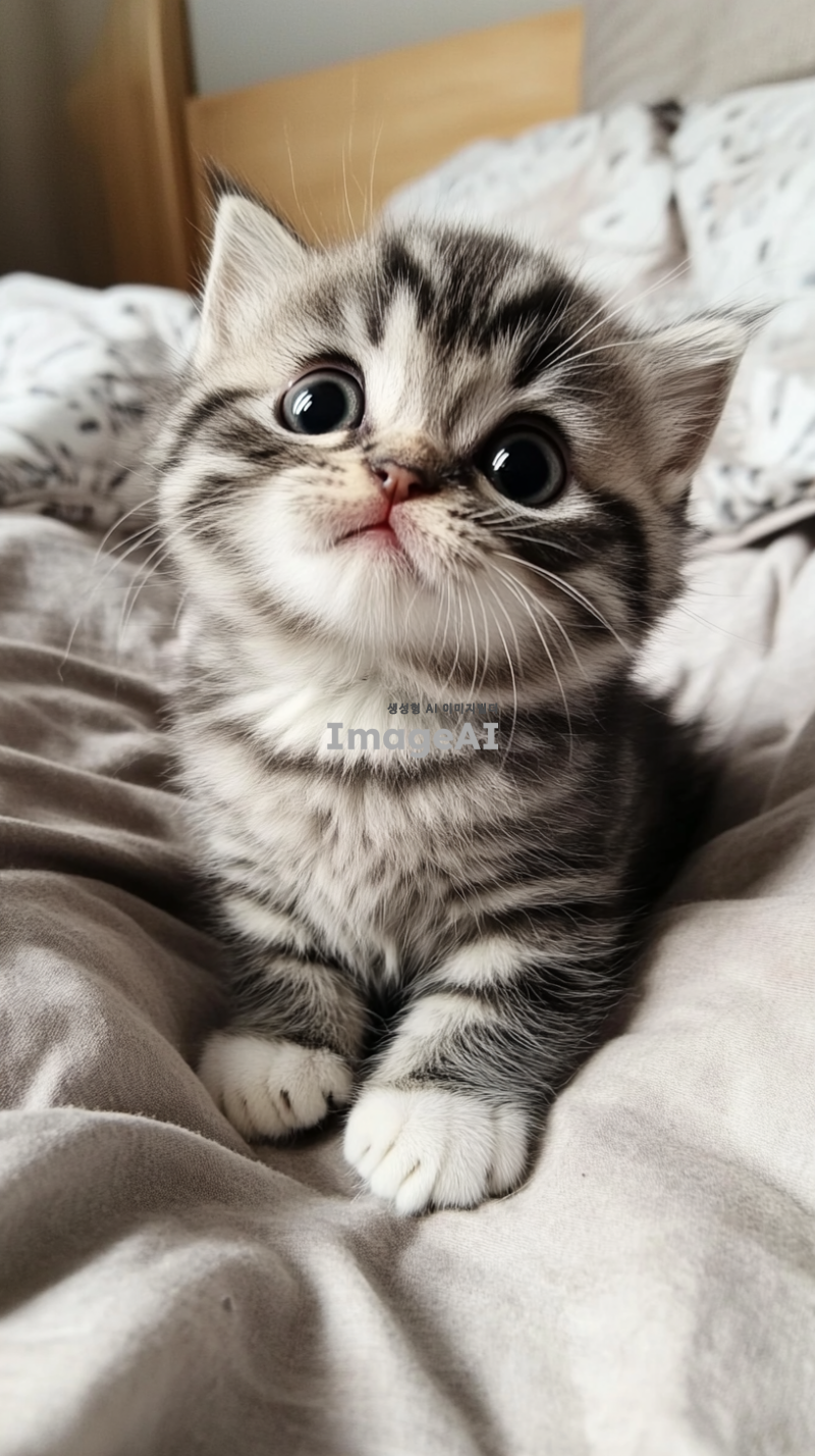 아주 귀여운 새끼 고양이가 침대에서 노는 모습, 회색과 검정 줄무늬, 큰 눈, 하얀 발, 털에 있는 화려한 패턴, 핑크색 코, 부드러운 털 질감, 귀여운 자세로 앉아 있으며 호기심 가득한 눈빛으로 당신을 바라보고 있습니다.