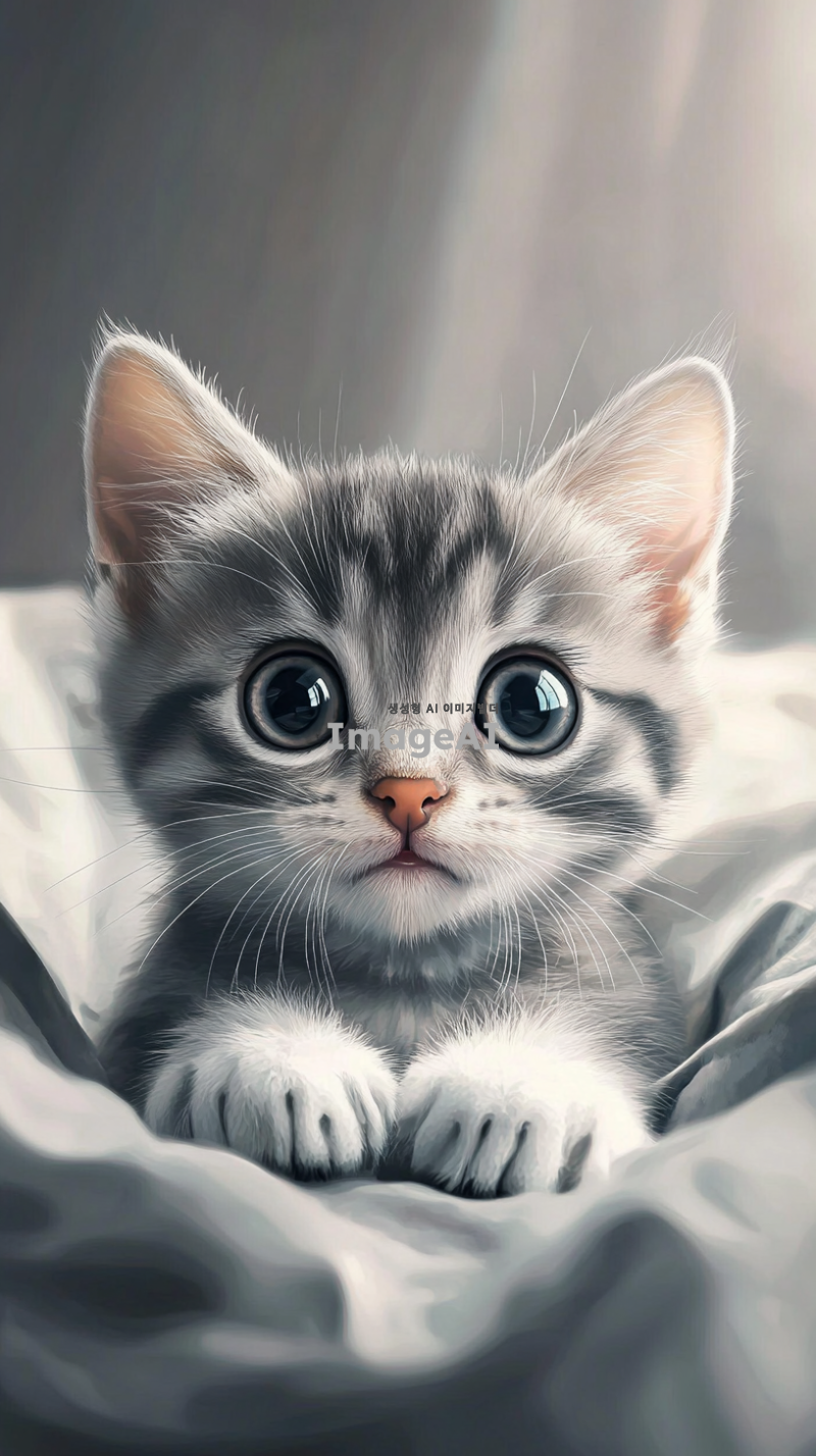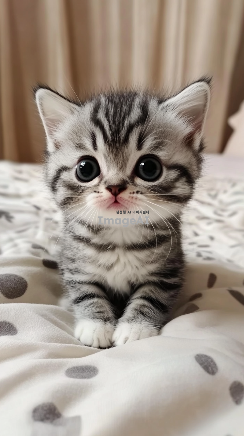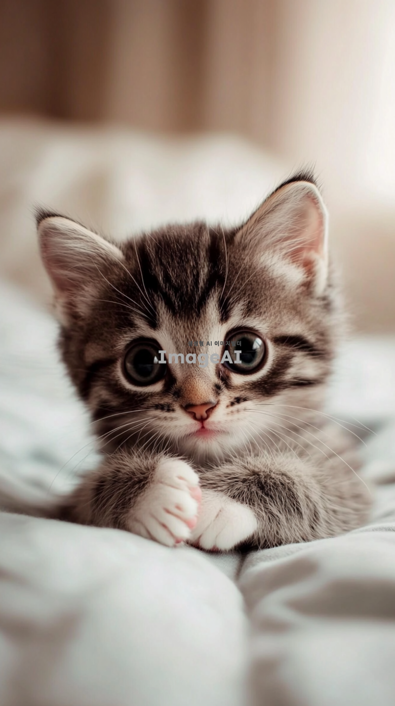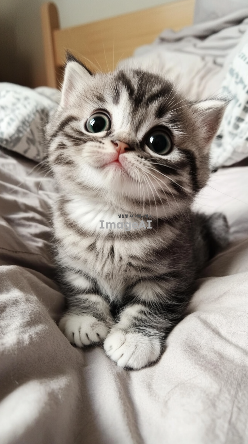 아주 귀여운 새끼 고양이가 침대에서 노는 모습, 회색과 검정 줄무늬, 큰 눈, 하얀 발, 털에 있는 화려한 패턴, 핑크색 코, 부드러운 털 질감, 귀여운 자세로 앉아 있으며 호기심 가득한 눈빛으로 당신을 바라보고 있습니다.