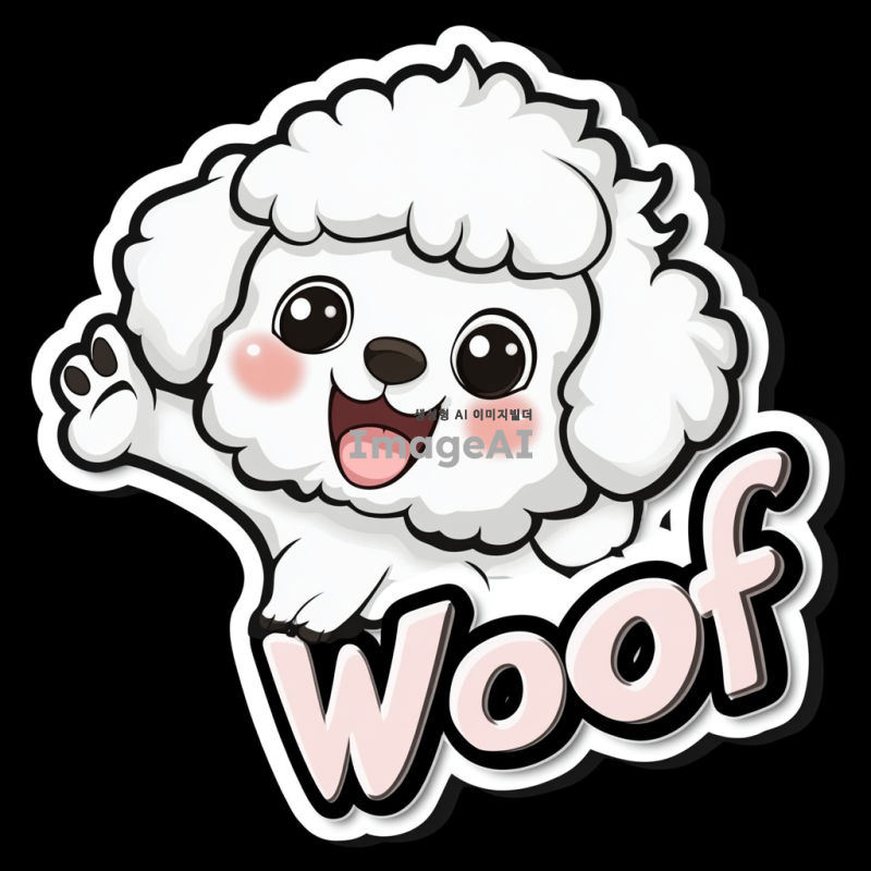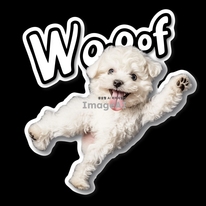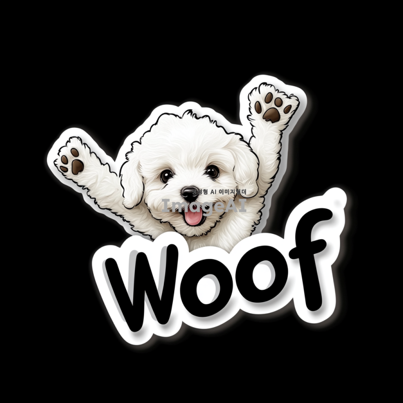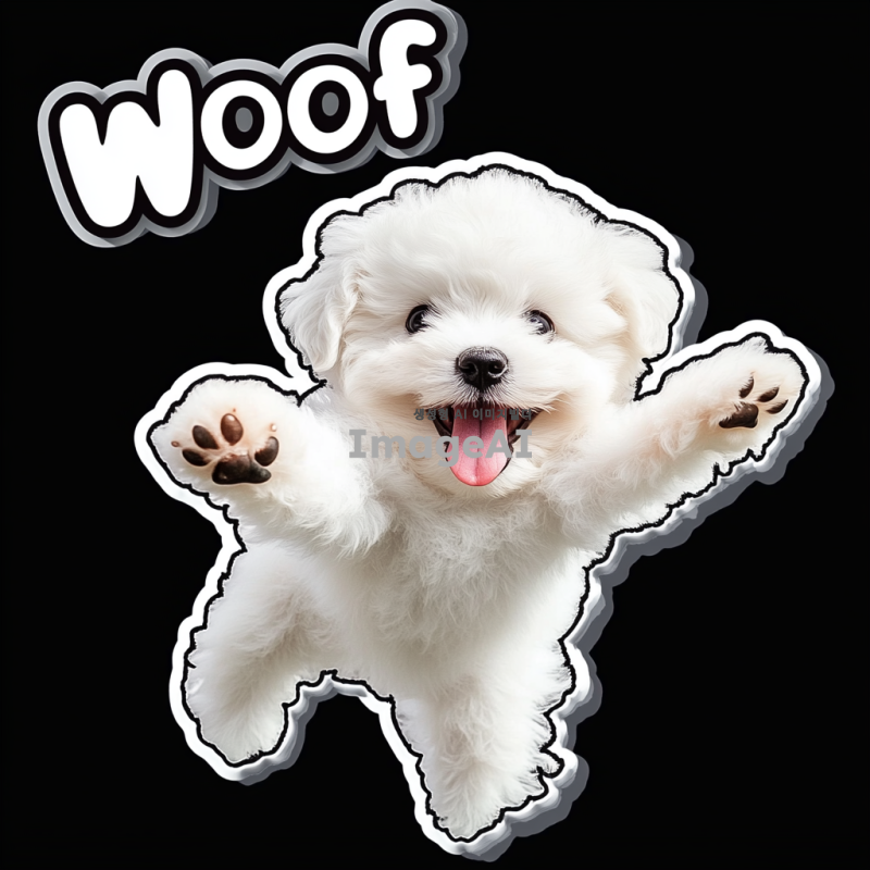 귀여운 흰색 비숑 프리제 강아지 스티커, "Woof"라는 단어가 공중에 떠 있는 모습, 검은색 배경, 귀여운 스타일, 단색 배경, 의인화된 표정, 고화질 및 고해상도 품질. 클라이밍
