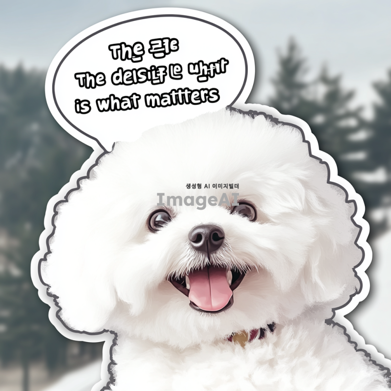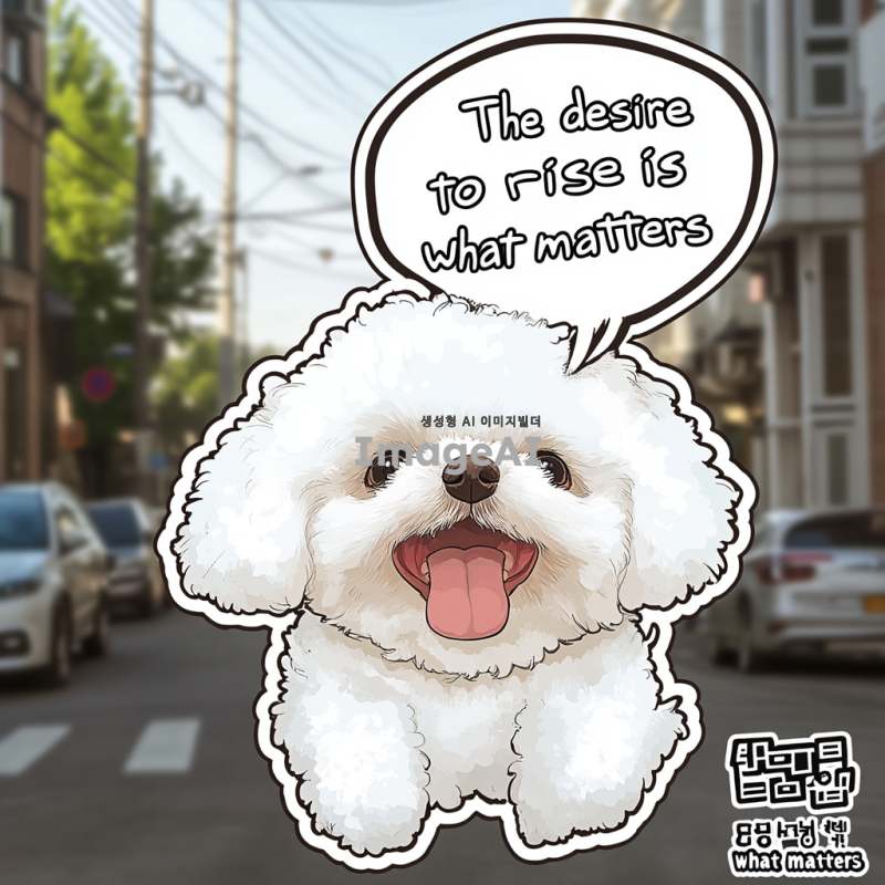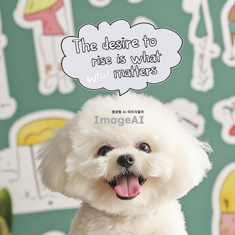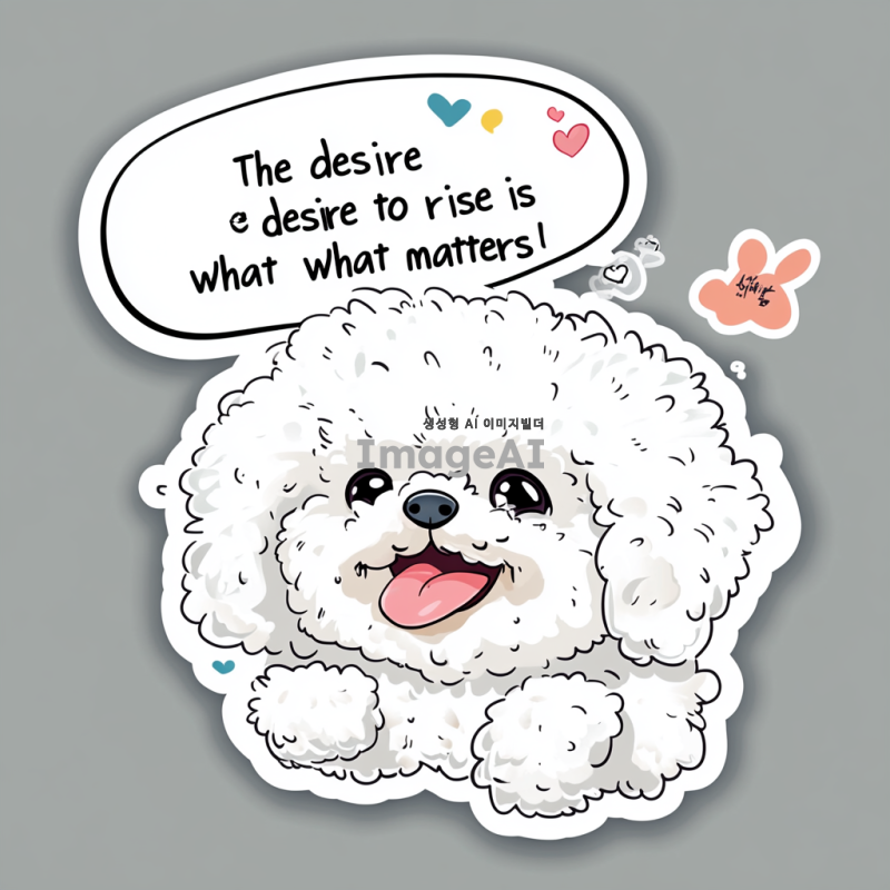 귀여운 비숑프리제 개가 공중에 떠 있는 스티커 스타일, 위에는 "올라가고자 하는 마음이 중요한 법" 한국어 글자가 말풍선 이미지 안에 적혀 있고, 배경은 클라이밍하고있습니다. 이 스티커는 좋은 기분과 행복을 위한 것입니다. 개는 흰색이며 긴 털이 눈을 가리고 있습니다. 위에서 보는 것을 궁금해하며 위를 바라보고 있습니다. 개는 귀엽고 짖는 표정으로 혀를 내밀고 작은 분홍색 코를 가지고 있습니다. 매력적이고 재미있습니다. 스티커에는 추가적인 텍스트나 단어가 없어야 합니다.