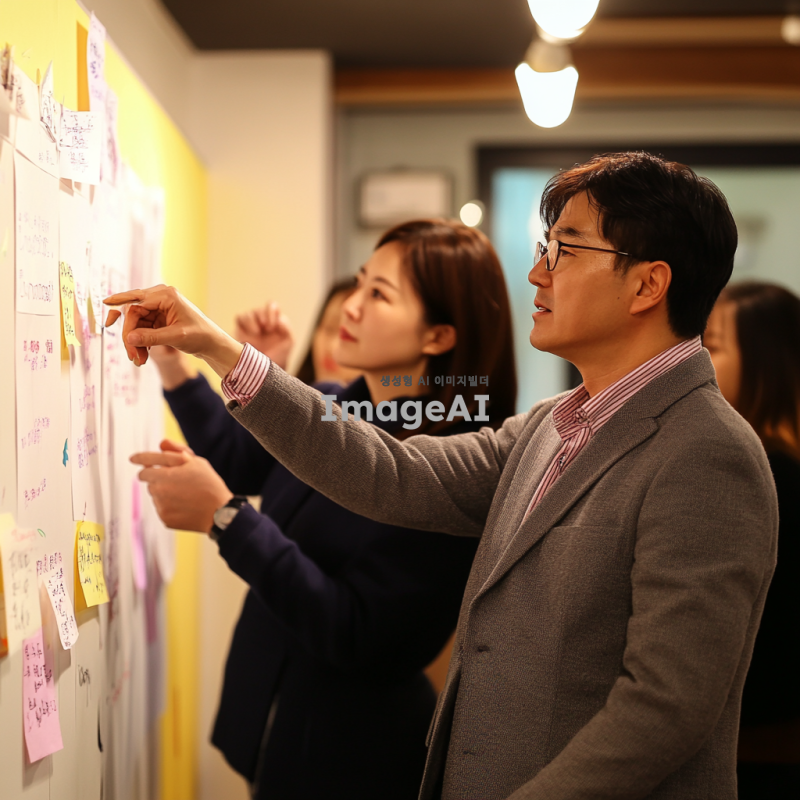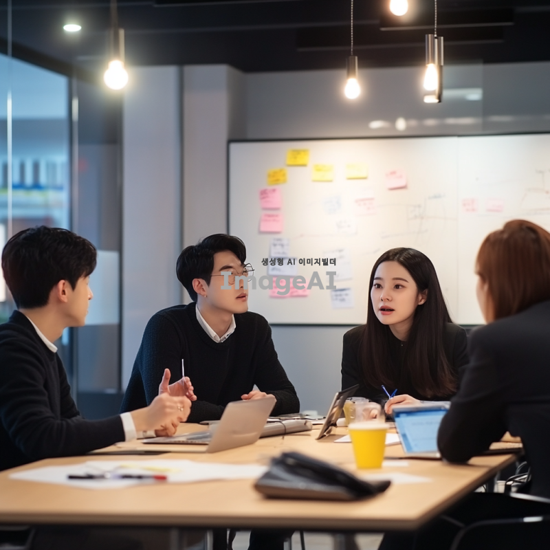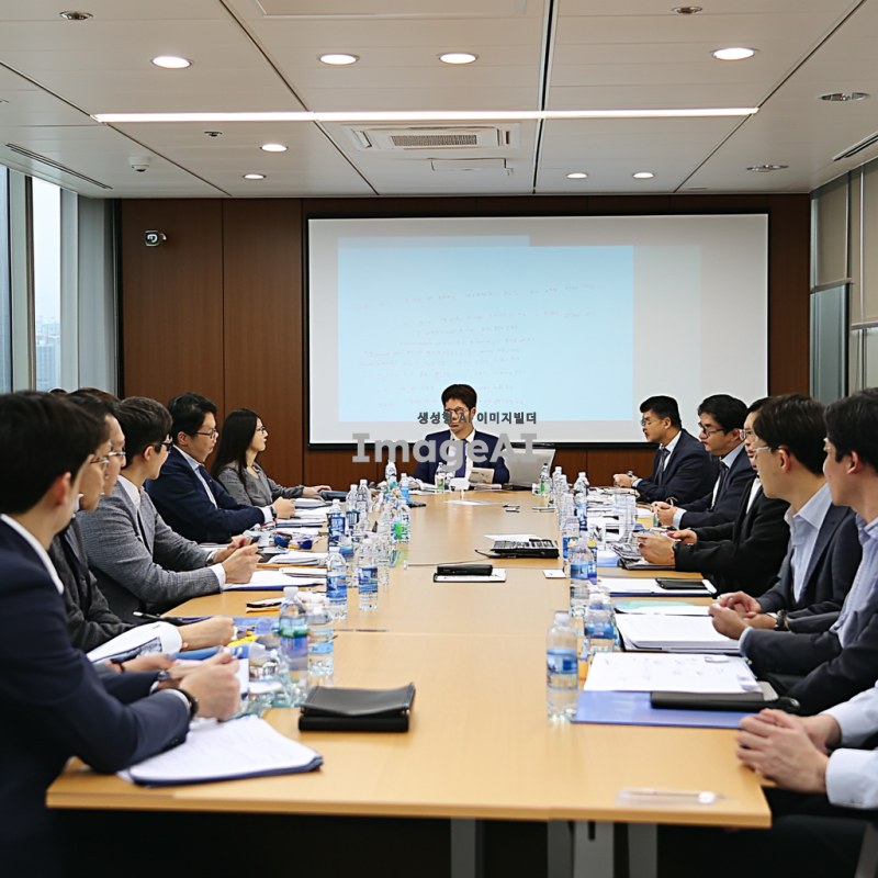 설 명절을 맞아 지역 경제 활성화와 소상공인 매출 증대를 위한 회의 중인 중소벤처기업부 관계자들, 회의실에서 다양한 의견을 나누고 있는 모습, 화이트보드에 아이디어가 적혀 있고, 참여자들은 진지하게 토론 중, 한국의 전통적인 설 명절 분위기, 따뜻한 조명과 함께 아늑한 공간, 소상공인 지원을 위한 적극적인 자세가 드러나는 장면.