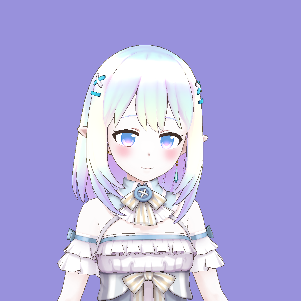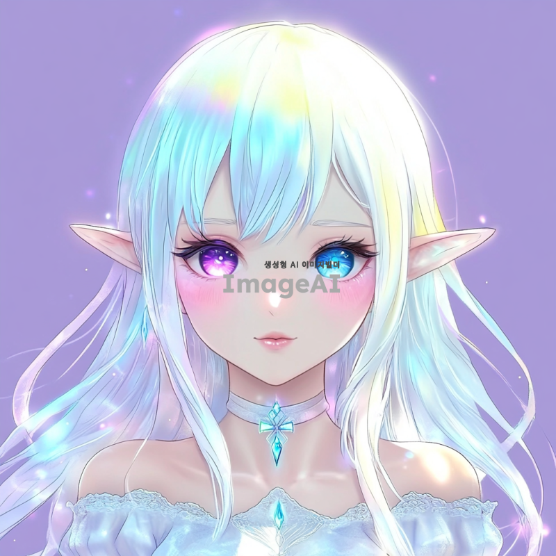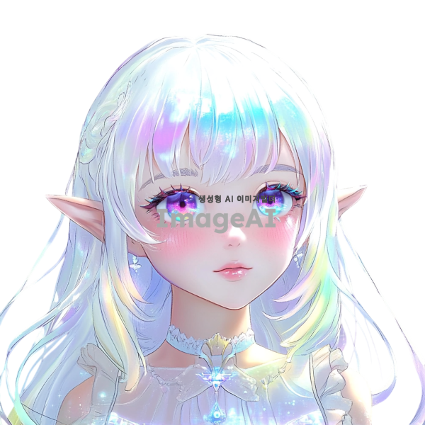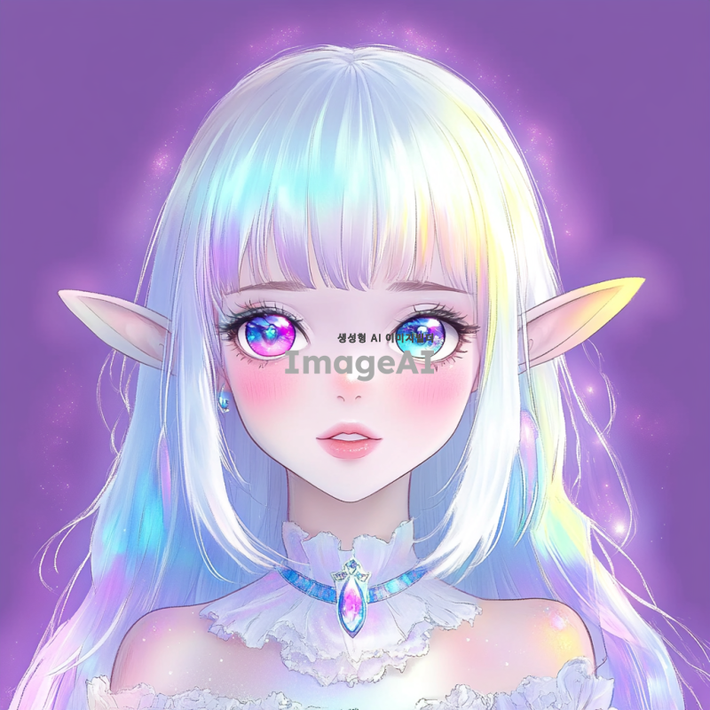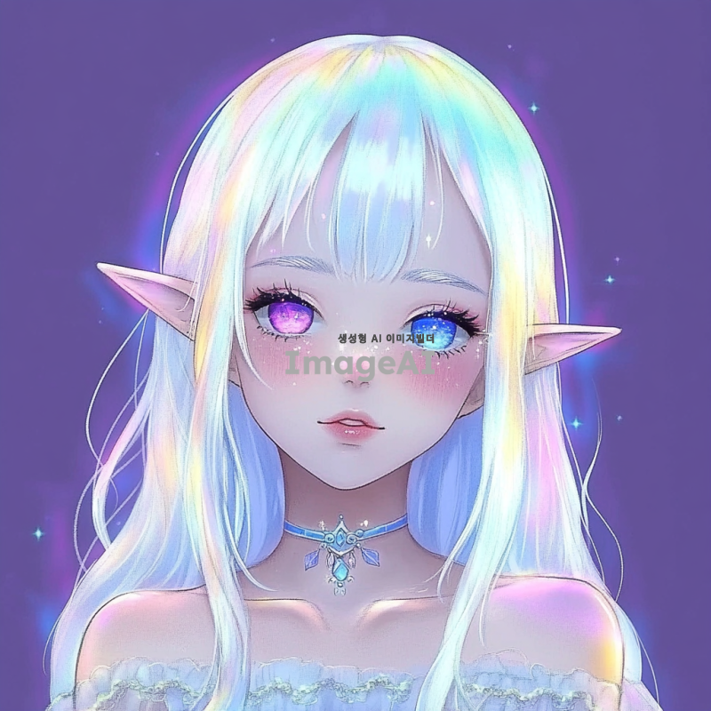 만화체 여자아이 머리는 백발에 오묘한 오색빛. 눈은 뿌옇게 보라 파랑 노랑 분홍이 섞인 눈 눈썹과 눈꼬리는 쳐졌고 피부는 하얗고 점이 없음 배경이 심비로움