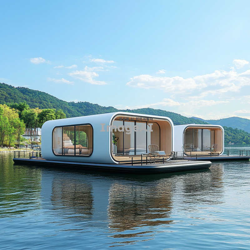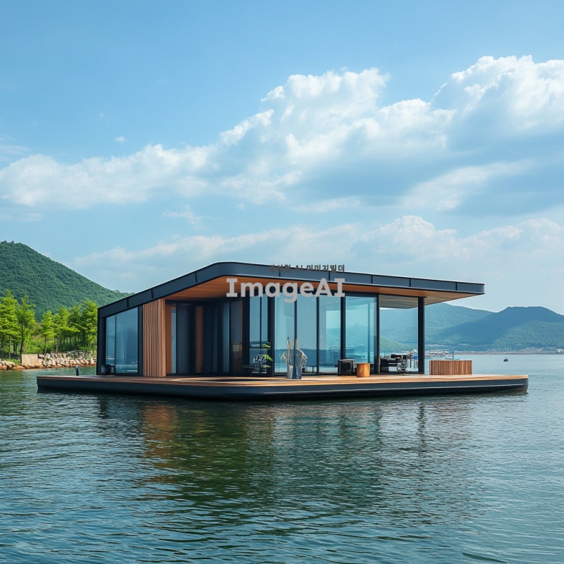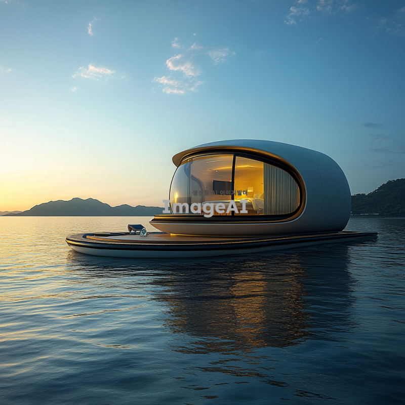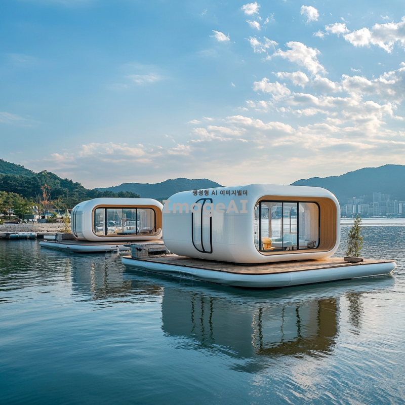 캡슐하우스와 폰툰보트가 조화를 이루는 풍경, 현대적이고 독창적인 디자인의 캡슐하우스가 물 위에 떠 있는 폰툰보트 위에 세워져 있는 모습, 주변에는 푸른 하늘과 맑은 물, 자연의 아름다움이 어우러진 장면, 따뜻한 햇살 아래 편안한 분위기, 한국의 전통적인 요소가 가미된 디자인, 세련된 색감과 조화로운 구성.
