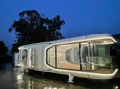 미래적이고 세련된 하이테크 전기 보트로, 파란 LED 조명이 있으며, 흰색 지붕과 어두운 회색 바디 색상 조합을 가지고 있습니다. 석양에 물 위에 주차되어 있습니다. 장면에는 하늘을 배경으로 실루엣으로 보이는 먼 산들이 포함되어 있어 고요하고 세련된 분위기를 만들어냅니다. 포토리얼리스틱 렌더링으로, 주변 조명 아래 호수 표면의 반사를 강조합니다.