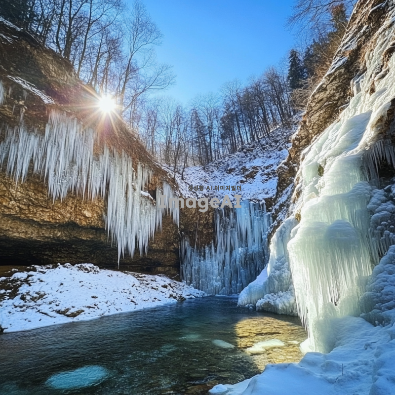계곡의 폭포수가 얼어붙어 다양한 형태의 얼음 꽃송이가 피어 있는 장면, 맑고 푸른 하늘 아래 눈부신 햇살이 얼음 꽃송이에 반사되어 빛나는 모습, 주변의 나무와 바위들이 얼음으로 덮여 있는 겨울 풍경, 차가운 공기 속에서 신비로운 아름다움이 느껴지는 자연의 모습.
