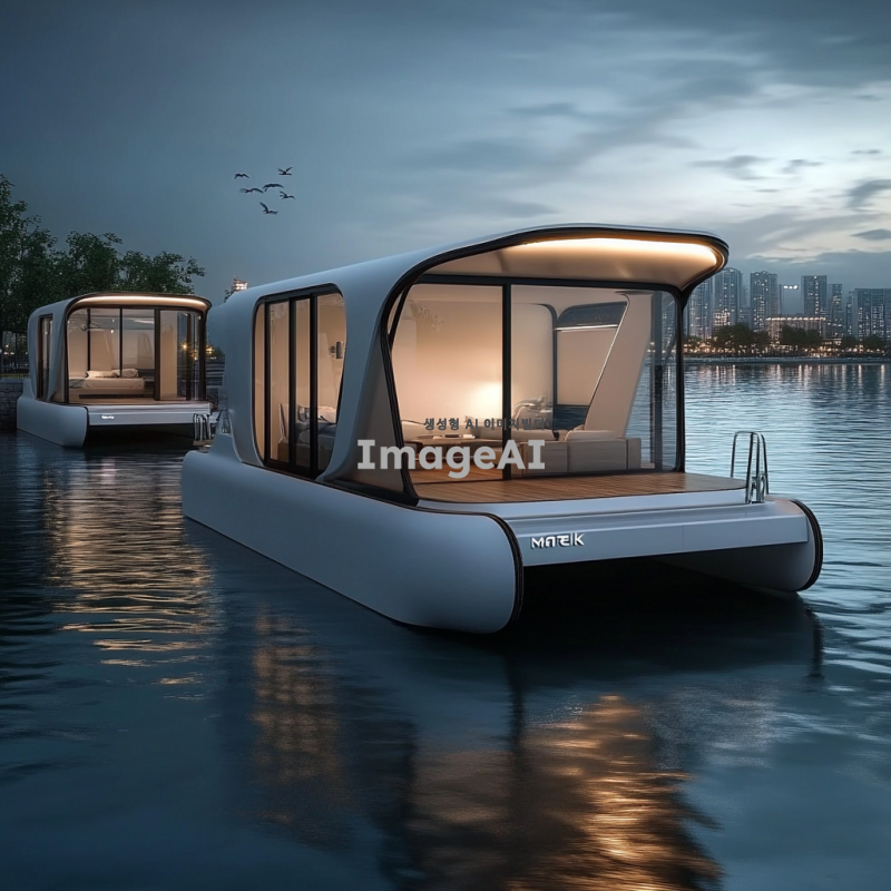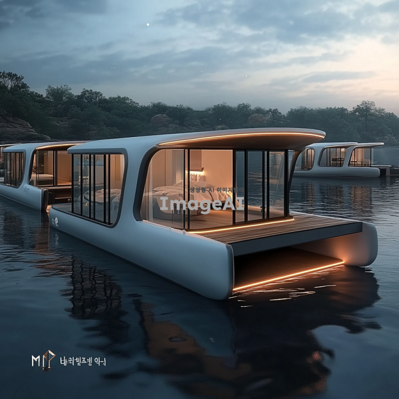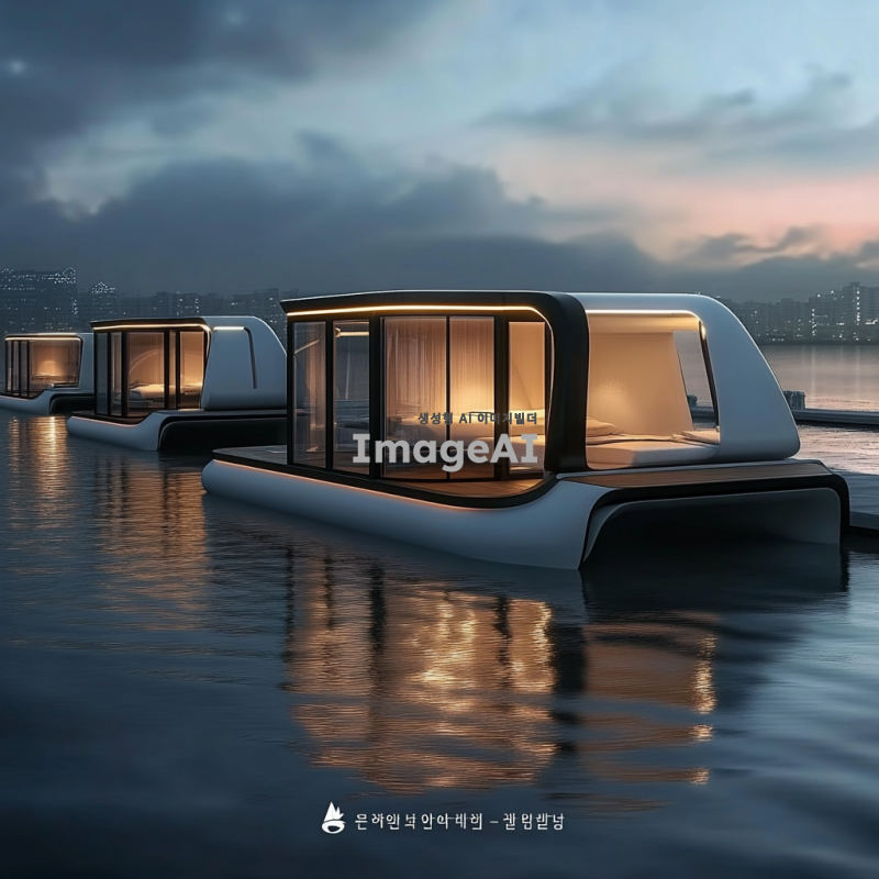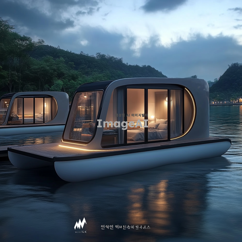 한국 폰툰보트 제조사 마텍의 폰툰보트와 캡슐하우스를 조합한 제품 이미지, 야간에 유리창테두리로 LED조명이 적용되고 수상위 계류장에 여러대가 정박되어 있는 보트형 캡슐하우스 단지이미지