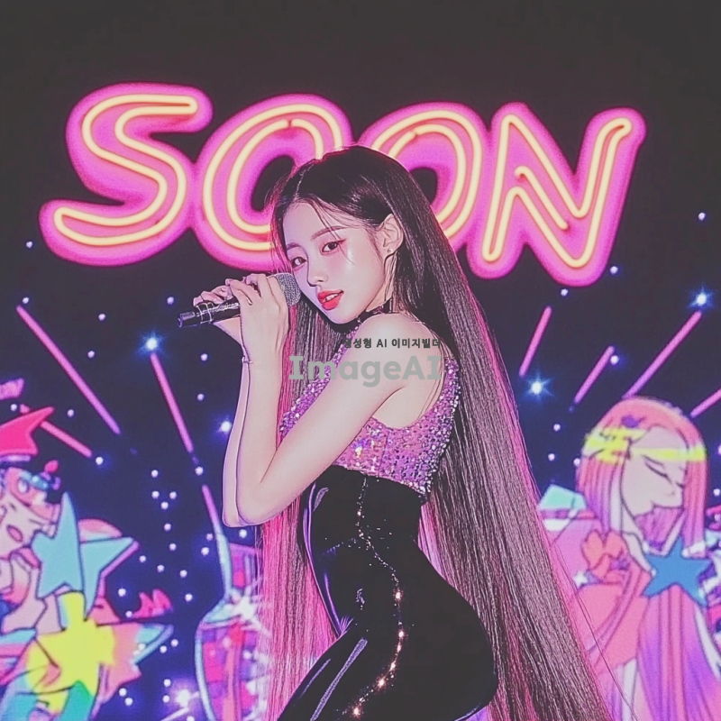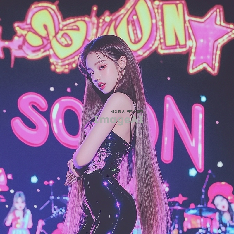 긴 생머리를 가진 한국 여자아이돌이 검정색 전신 타이즈를 입고 화려한 무대에서 춤추고 있는 모습. 배경에는 SOON 모양의 네온 무대 조명이 반짝이고, 귀여운 얼굴이 돋보이는 장면.