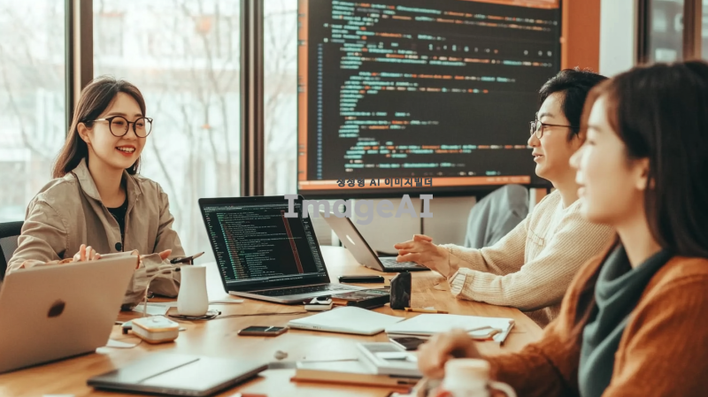 한국의 IT 전문가가 최신 기술 동향에 대해 토론하는 모습, 현대적인 사무실 환경에서 다양한 디지털 기기와 함께 앉아 있는 모습, 배경에는 대형 스크린에 데이터 분석 그래프와 코드가 표시되어 있음, 집중하는 표정으로 서로 의견을 나누는 모습, 세련된 복장과 함께 전문적인 분위기 강조.
