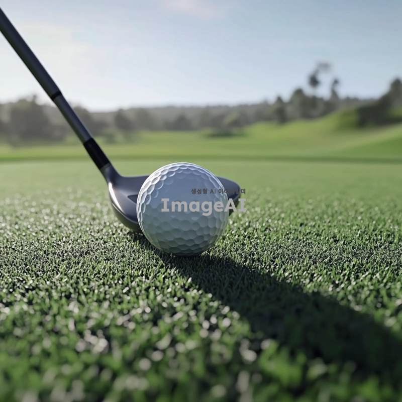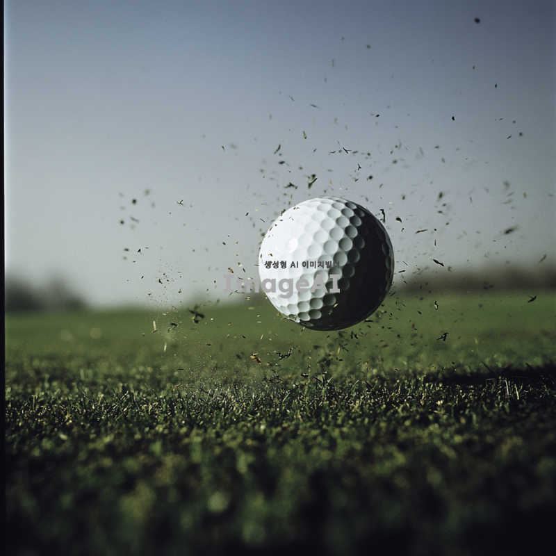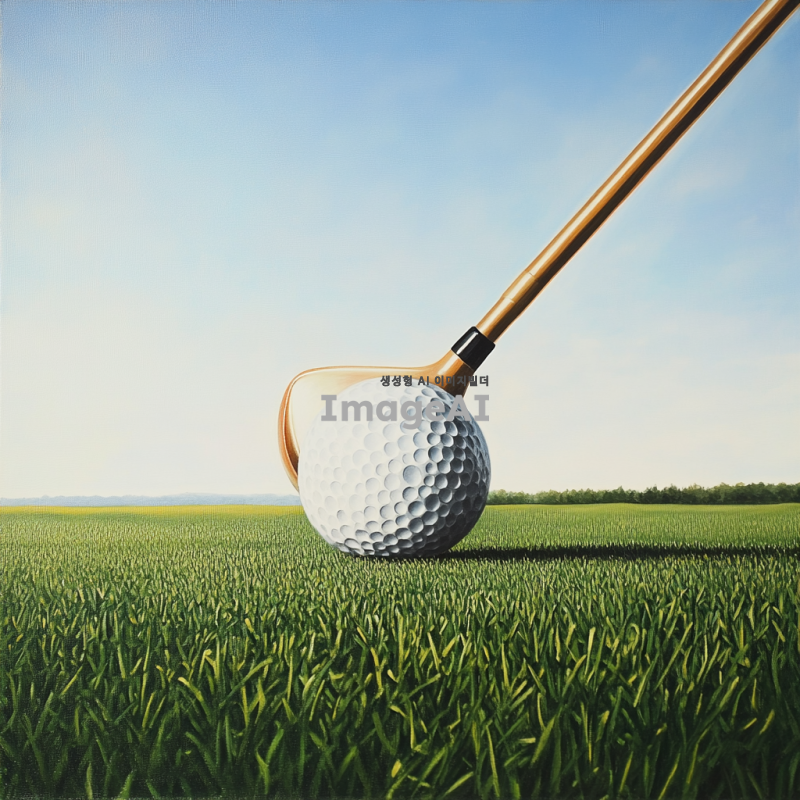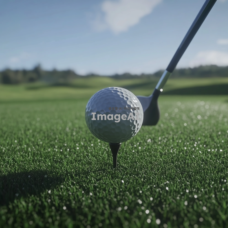 필드에서 티에 꽂혀 있는 골프공이 골프채에 정타로 맞는 순간을 포착한 이미지. 골프공이 클로즈업으로 강조되어 있으며, 배경에는 푸른 잔디와 맑은 하늘이 보인다. 골프채가 골프공에 정확히 맞는 모습이 생생하게 표현되어 있다.