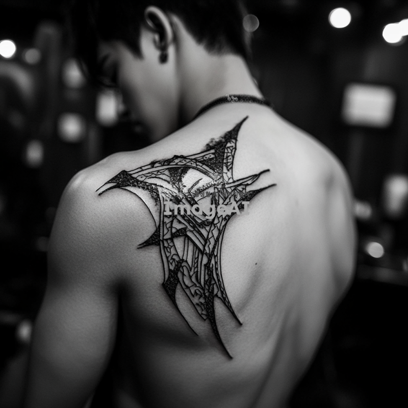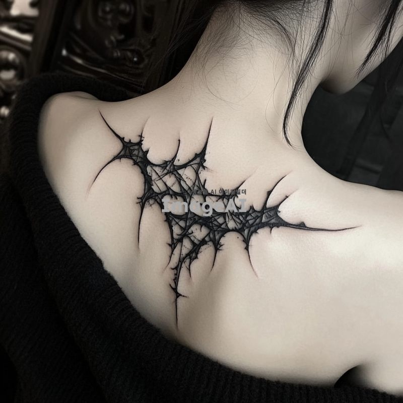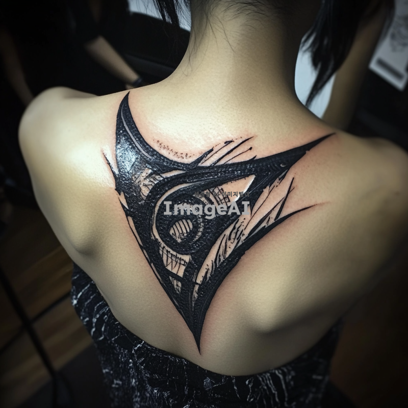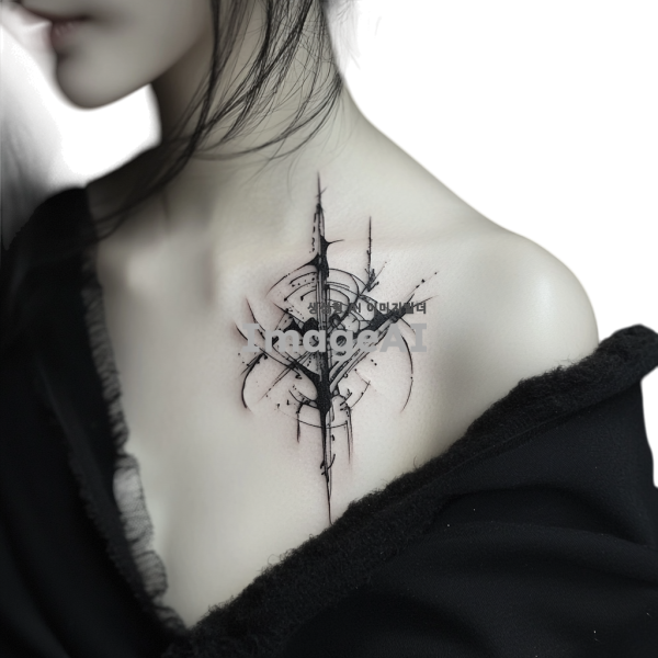 어둡고 거친 느낌의 흐름을 가진 비대칭적인 tribal 타투 디자인, 어깨와 가슴까지 이어지며 불규칙하고 굵은 선으로 구성되고 끝이 뾰족한 형태, 한국인 모델이 타투를 하고 있는 모습, 강렬한 분위기와 독특한 패턴 강조, 배경은 어두운 색조로 설정.