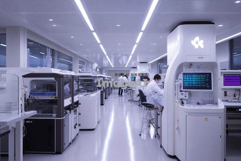 한국의 현대 의료 환경을 배경으로 한 의료 과학 연구실, 실험 장비와 샘플이 가득한 공간, 연구원들이 실험을 진행하고 있는 모습, 다양한 의료 기기와 컴퓨터 화면에 데이터 분석 결과가 표시되어 있는 장면, 깨끗하고 정돈된 환경, 밝은 조명 아래에서 집중하는 연구자들의 모습, 생명과학의 발전을 상징하는 이미지.