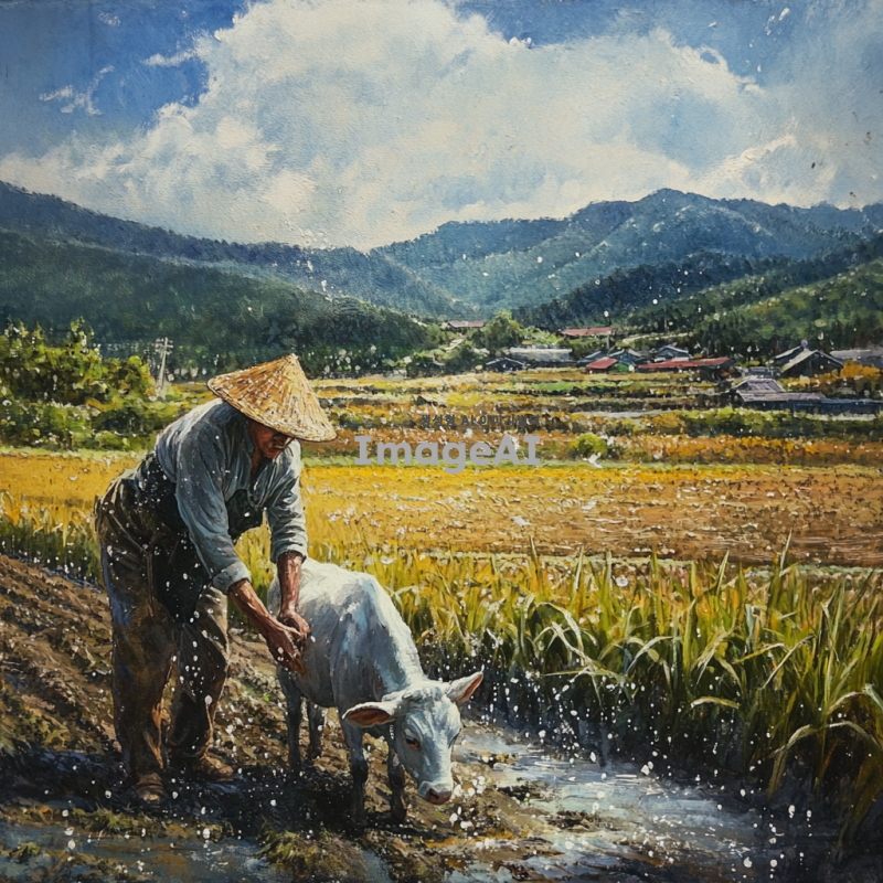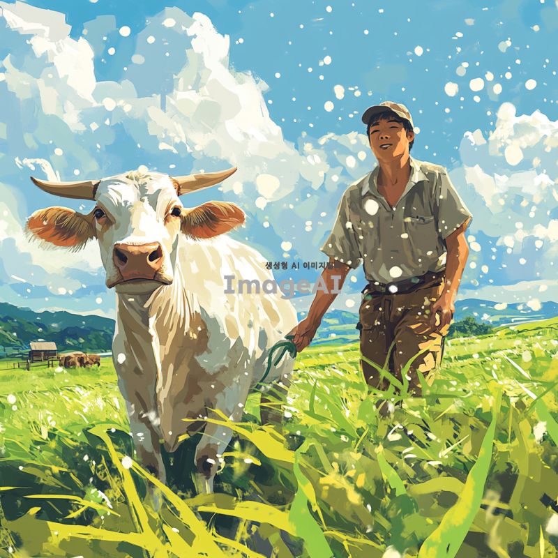 땀을 흘리며 힘들게 일하는 한국의 소, 농촌 배경, 푸른 들판과 하늘, 햇빛 아래에서 땀방울이 맺혀 있는 모습, 소의 근육이 강조된 모습, 자연의 생동감이 느껴지는 장면