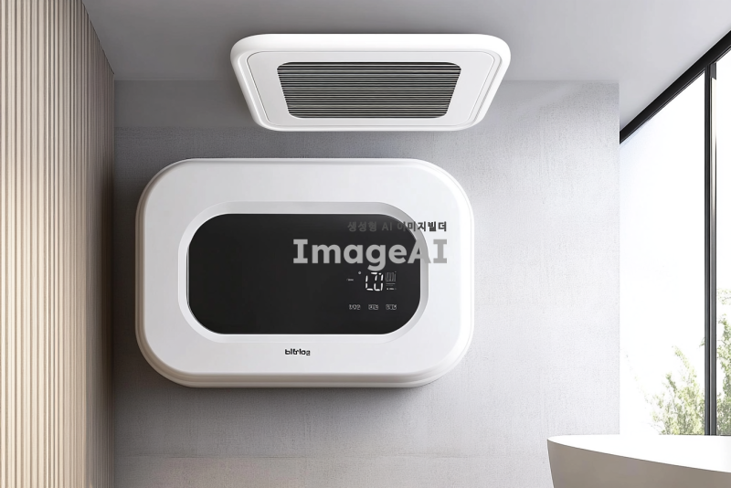 천정형 욕실용 환기팬 제품 디자인, 치수는 477mm*314mm*260mm, 전동댐퍼가 장착되어 있으며 환기와 온풍 기능을 갖추고 있는 모습, 제습 및 건조 기능이 강조된 디자인, 현대적이고 세련된 느낌의 외관, 실용성과 기능성을 강조한 디테일, 배경 없이 제품만 부각된 형태로 표현.