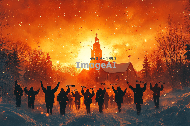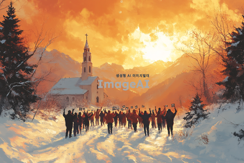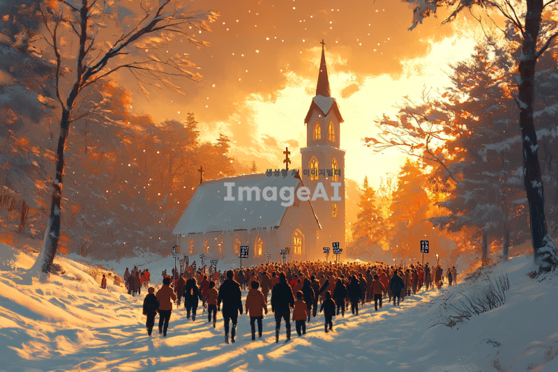 겨울 수련회 분위기의 교회 찬양 플레이리스트 썸네일, 따뜻한 색감의 배경, 눈 내리는 풍경과 함께 교회 건물의 실루엣, 찬양하는 사람들의 모습, 성경 구절이 적힌 손팻말, 아늑하고 영적인 느낌, 한국인 모습의 청소년들이 함께 모여 즐거운 표정으로 찬양하는 장면, 겨울의 따뜻함과 신앙의 기쁨을 전달하는 이미지