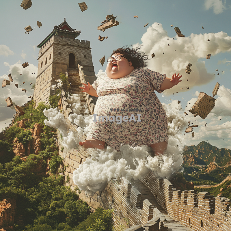 뚱뚱한 한국 여성이 중국의 만리장성을 몸통박치기로 부수는 장면, 힘찬 모습과 함께 만리장성이 무너지는 순간, 주변의 경치와 함께 생동감 있게 표현, 유머러스한 분위기.