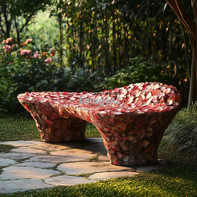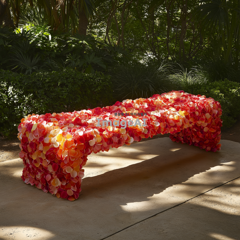 장미꽃잎으로 아름답게 디자인된 아트벤치, 섬세한 꽃잎의 질감과 색상이 조화롭게 어우러진 모습, 자연 속에 배치된 벤치, 따뜻한 햇살 아래에서 편안하게 쉴 수 있는 공간, 세련된 현대적인 스타일과 자연의 아름다움이 조화를 이루는 장면.