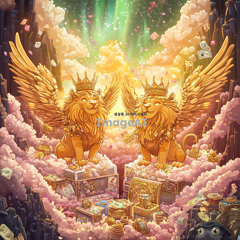 오묘한 오로라빛으로 물든 우주 공간, 꽃 구름 사이에서 황금 숫사자와 황금 암사자가 왕관을 쓰고 황금망토를 두른 채 날개짓을 하고 있다. 사자들의 주위에는 화려한 돈과 보석들이 가득 깔려 있으며, 앞에는 다양한 보물상자들이 쌓여 있다. 환상적이고 신비로운 분위기의 장면.
