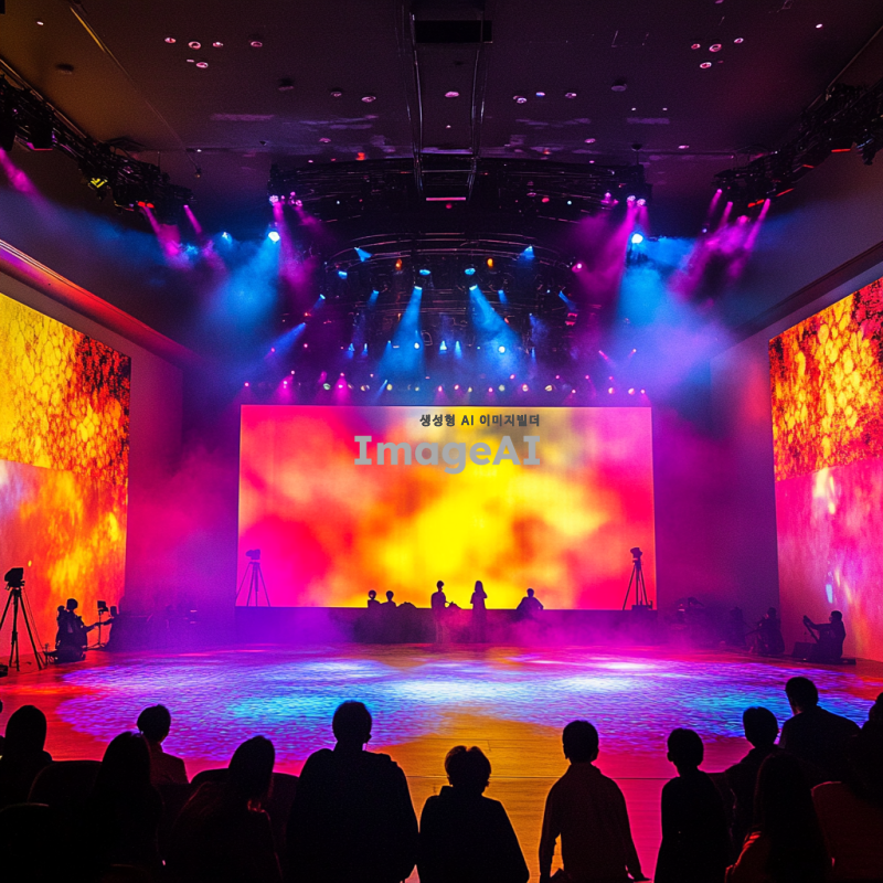 한국의 현대적인 행사 현장, 화려한 조명이 설치된 무대, 다양한 장식과 배경이 어우러진 모습, 관객들이 즐겁게 참여하는 분위기, 생동감 넘치는 색감과 조명 효과, 세련된 디자인의 무대 구성, 감동적인 순간을 포착한 장면