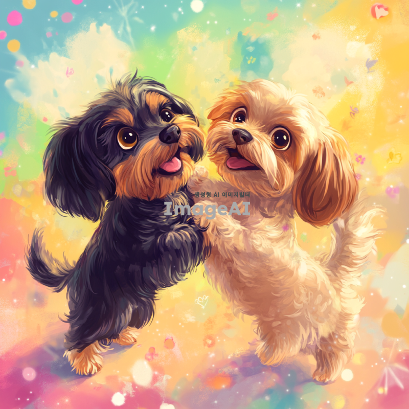 장난치는 단모닥스훈트와 시츄가 함께 놀고 있는 모습, 밝고 화사한 배경, 귀여운 표정으로 서로 장난치는 모습, 푹신한 털과 큰 눈, 아기자기한 느낌의 일러스트 스타일.