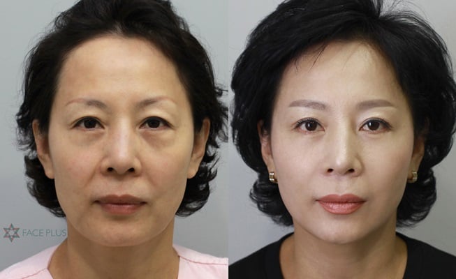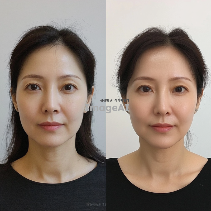 한국인 중년 여성이 얼굴 피부 관리를 받기 전과 후의 모습을 나란히 비교하는 사진. 왼쪽에는 피부 관리 전의 자연스러운 모습, 오른쪽에는 피부 관리 후의 밝고 매끄러운 피부를 강조한 모습. 밝은 조명 아래에서 피부의 변화를 잘 드러내며, 편안한 실내 환경에서 촬영된 느낌.