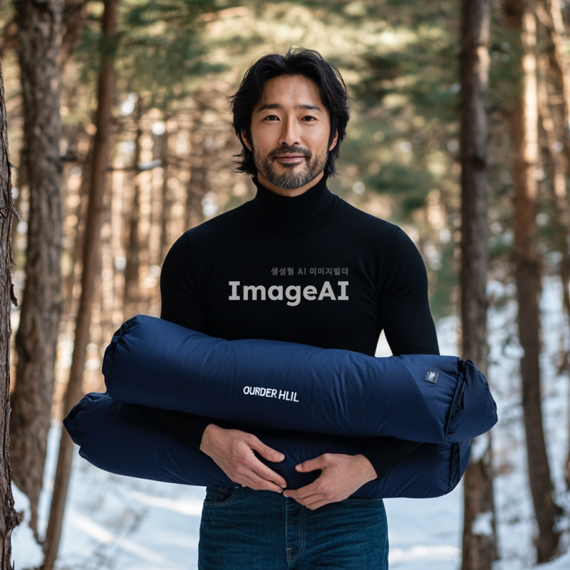 30대의 한국인 남성으로, 짧고 잘 다듬어진 수염과 어깨를 넘는 긴 검은 머리를 가진 rugged한 모습. 검은 터틀넥과 파란 청바지를 입고 있으며, 고요한 겨울 숲 속에 서 있습니다. 눈으로 덮인 높은 나무들이 주변에 있으며, 바닥에는 부드러운 눈이 깔려 있습니다. 남성은 가슴 높이에서 'UNDER HILL' 로고가 크게 인쇄된 두 개의 네이비 블루색 침낭을 들고 있습니다. 침낭은 그의 손바닥으로 받쳐져 있으며, 자연스러운 미소를 지으며 자신감 있고 친근한 분위기를 풍깁니다. 그의 눈은 자연스럽고 표현력이 풍부하며, 한국인으로서의 얼굴 특징이 잘 드러나 있습니다.