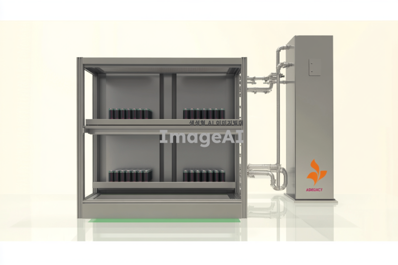 밀폐된 부스 내부가 잘 보이는 장면, 부스 안에는 3단 선반이 4~5개 있으며 각 선반 위에는 배터리 셀들이 2센치미터 간격으로 세로로 가득 꽂혀 있는 모습. 부스 옆에는 사이클론 집진기, 여과 집진기, 흡착탑이 배관으로 순서대로 연결되어 있는 구조. 전체적으로 산업적인 느낌과 세밀한 디테일이 강조된 이미지.