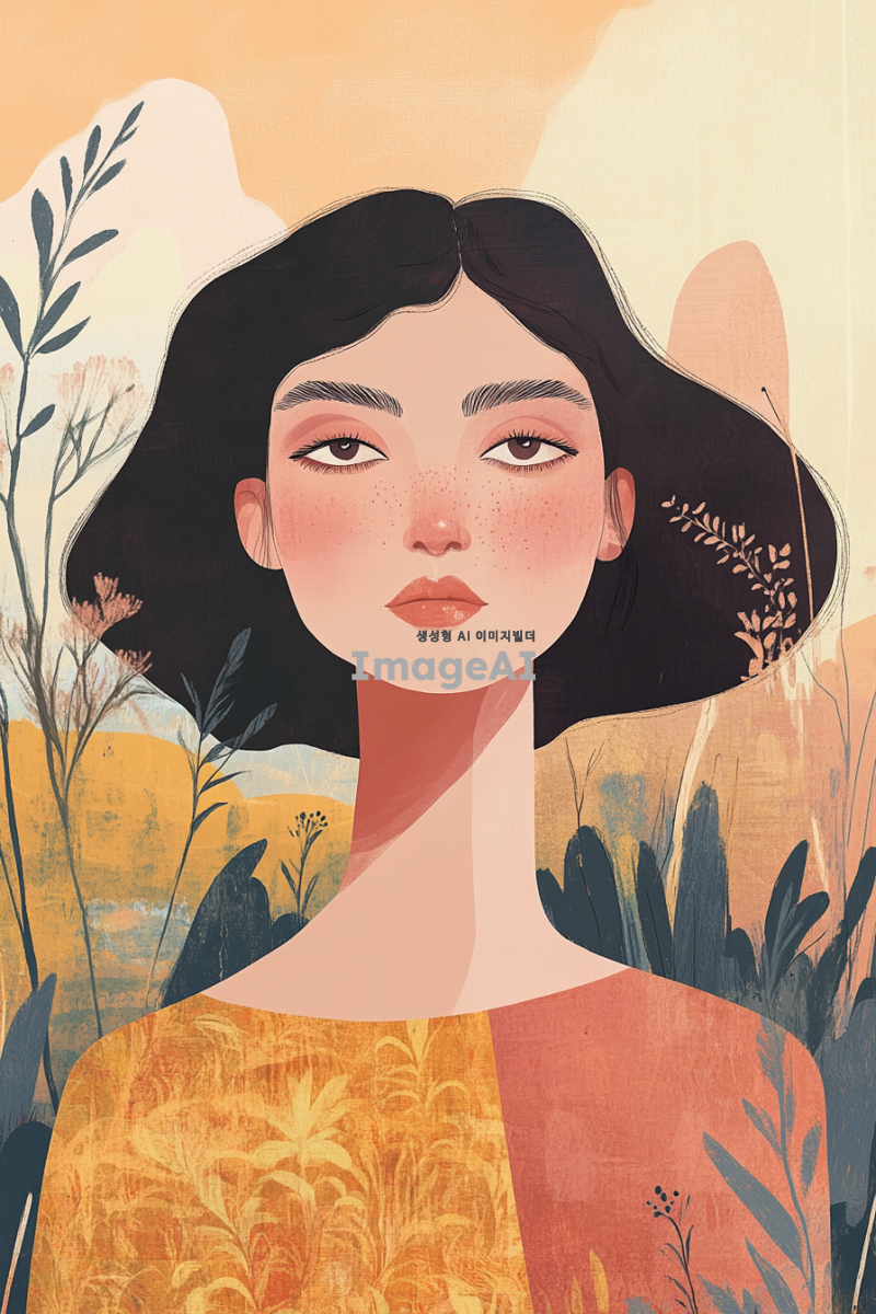 여성의 몸은 정면을 향하고 있으며, 그녀의 눈은 오른쪽을 바라보고 있는 모습. 배경은 부드러운 색조의 자연 풍경으로, 여성은 편안한 표정을 지으며 세련된 의상을 입고 있다. 조명은 따뜻하고 부드럽게 비추어져 있으며, 전체적인 분위기는 평화롭고 조화롭다.