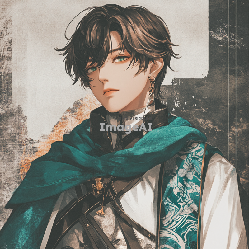 짙은 갈색 머리카락을 가진 한국 남성이 녹색 눈을 가지고 있으며, 장난스러운 눈매를 지닌 모습. 성숙한 매력을 발산하는 캐릭터로, 배경은 자연 풍경으로 설정하여 그의 매력을 강조. 웹툰 스타일의 그림체로 그려주며, 신비로운 문양이 그려진 은색 갑옷을 입고 그 위에 망토를 걸친 모습. 중세 시대의 분위기를 느낄 수 있도록 표현하며, 장난스럽게 웃고 있는 모습으로 입꼬리만 조금 올라가도록.