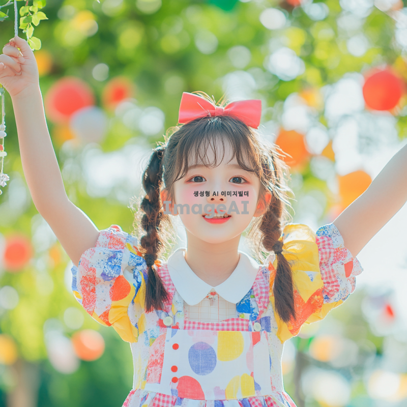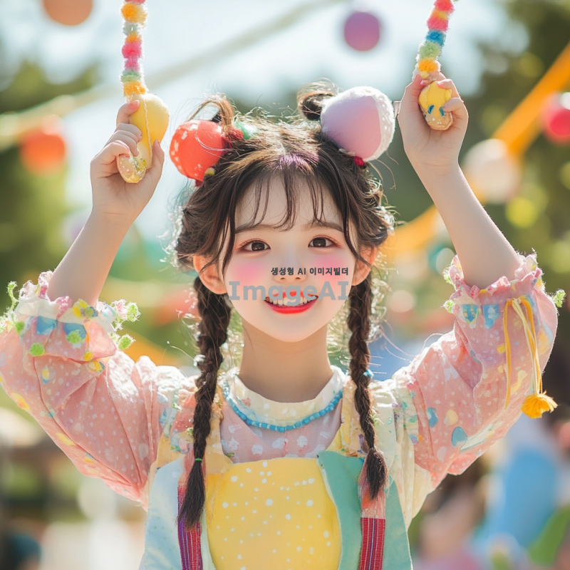 귀여운 한국인 여자, 오른쪽 팔 하나와 왼쪽 팔 세 개가 달린 독특한 모습, 밝고 화사한 색상의 의상, 귀여운 표정, 배경은 화창한 공원, 아기자기한 소품들로 꾸며진 환경, 전체적인 분위기는 경쾌하고 즐거운 느낌.