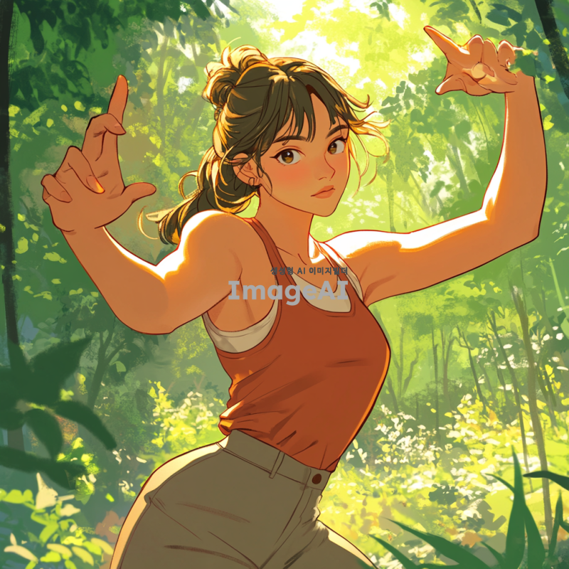 오른쪽 팔이 하나, 왼쪽 팔이 세 개가 달린 여성을 그려주세요. 그녀는 다양한 포즈를 취하고 있으며, 각 팔은 독특한 자세와 표현을 가지고 있습니다. 배경은 자연 풍경으로, 햇살이 비추는 아름다운 정원입니다. 여성의 의상은 현대적이고 세련된 스타일로, 다양한 색상이 조화를 이루고 있습니다.