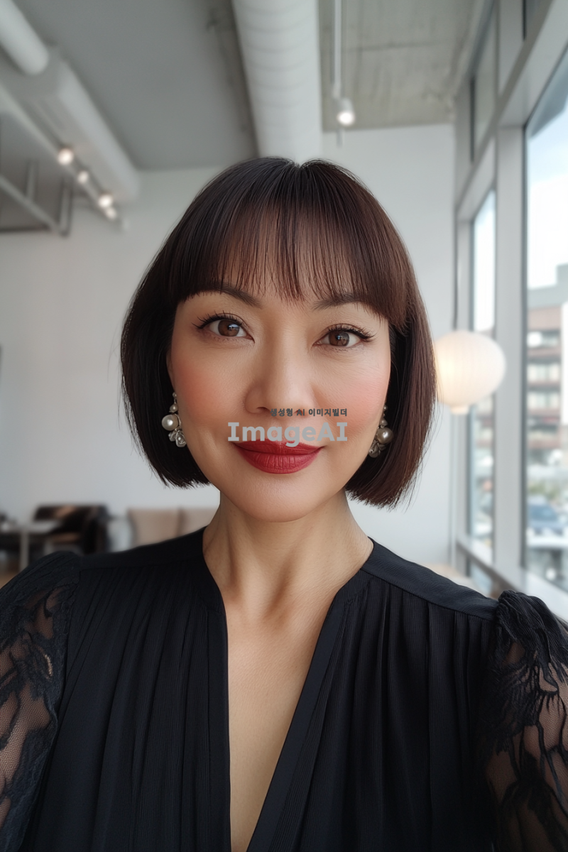 아시아 여성의 짧은 머리로, 검은 블라우스를 입고 진주 귀걸이를 착용한 채로 현대적인 한국 카페 앞에서 찍은 셀카. 그녀는 큰 눈과 밝은 갈색 피부톤, 앞머리가 있는 직선 보브컷, 통통한 입술, 타원형 얼굴형을 가지고 있다. 배경은 흰 벽과 유리 창문으로, 외부 도시 풍경이 보인다.